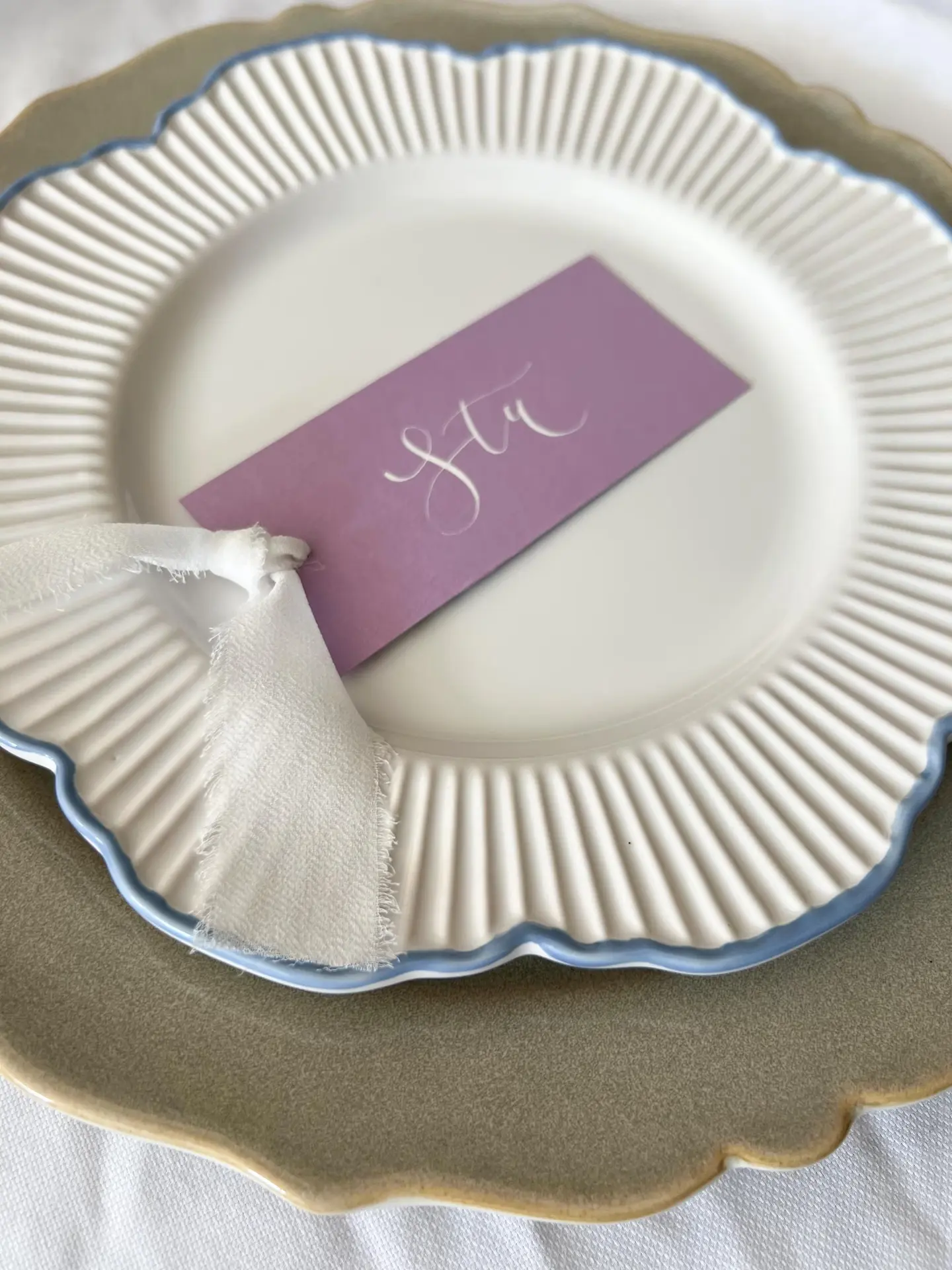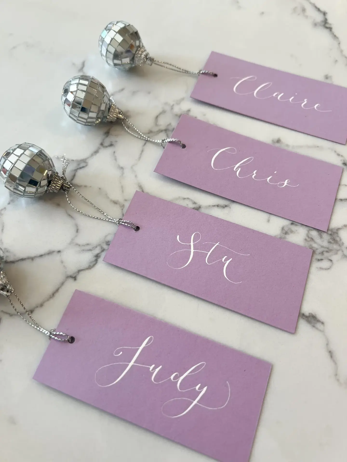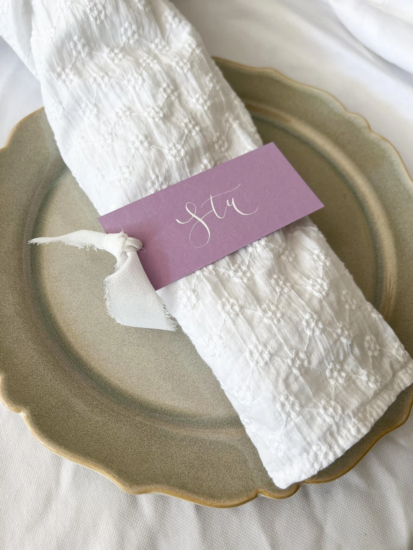 Handwritten Modern Calligraphy in white ink on thick smooth lilac place cards.
