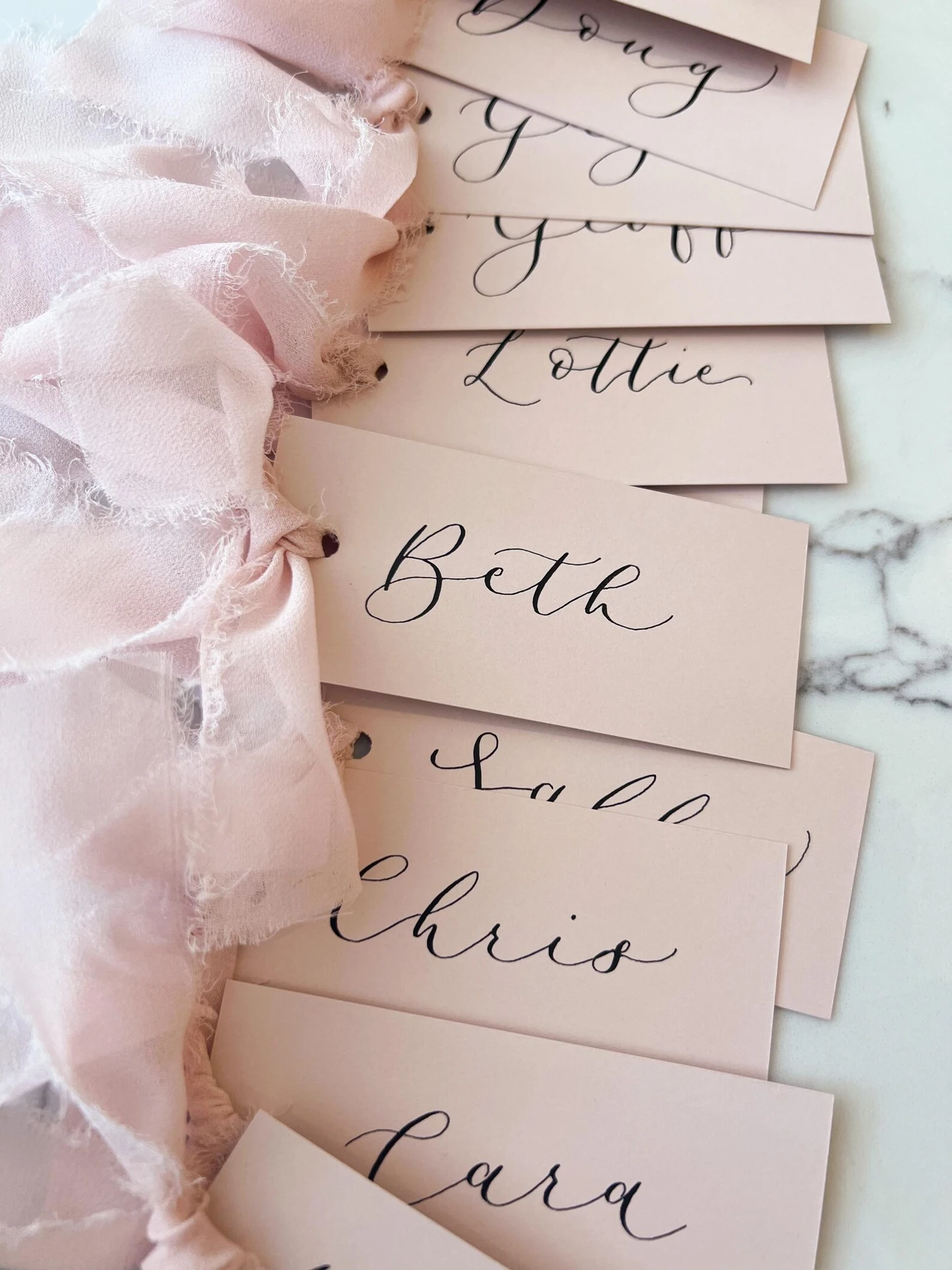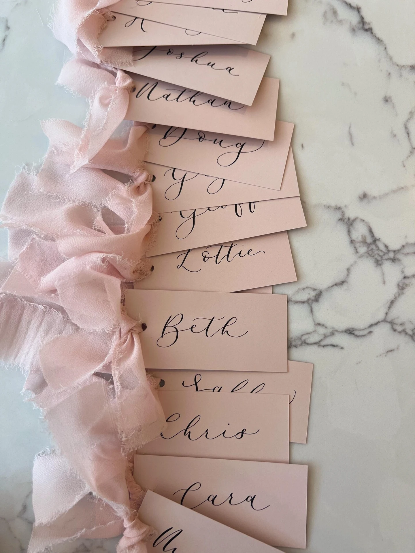 An elegant personalised addition to your event tablescape, these place cards are handwritten in modern calligraphy using black ink on thick smooth pale pink place cards. Pale pink chiffon style ribbon hand tied to each.