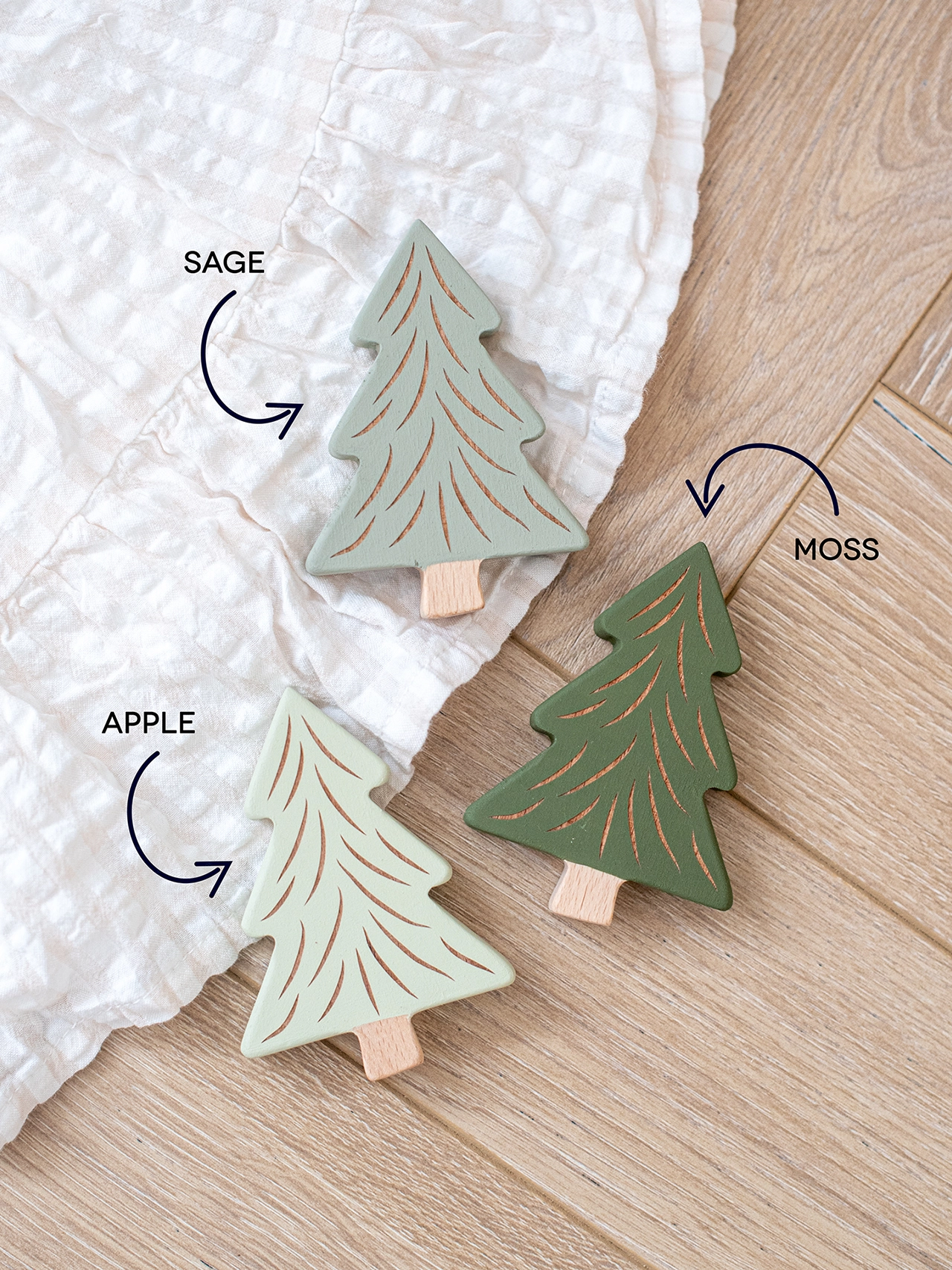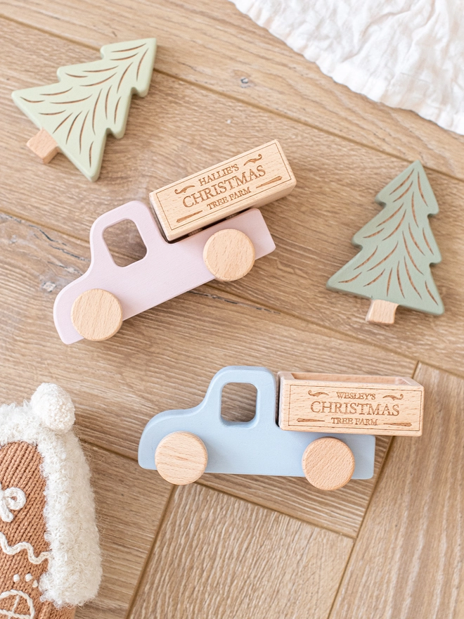 The truck body is painted in your choice of colour, maybe you'll opt for iconic Christmas red or maybe a shade of pastel. Choose from three colours for the tree. The wheels move to allow the truck to be played with and the tree can be removed from the bed. Our main image shows a red truck with moss tree, Hallie's truck is blush with an apple tree and Wesley's truck is dove with a sage tree.