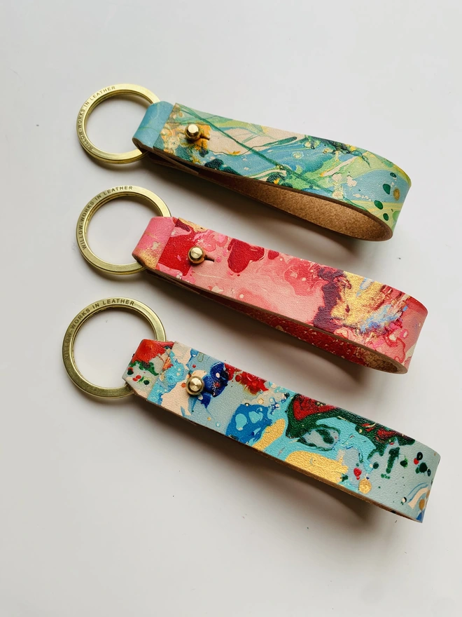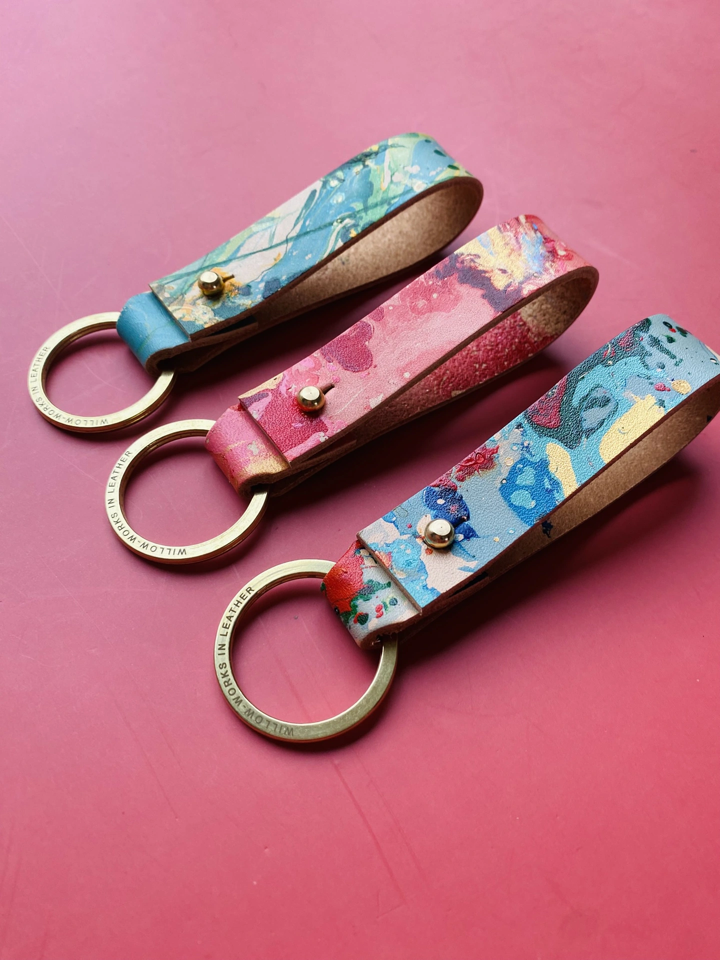 These beautiful statement key loops are each hand marbled using an age old traditional technique of floating paints and dyes on the surface of water to create a truly one-of-a-kind pattern. Available in a range of stunning colourways, no two pieces will ever be the same.
