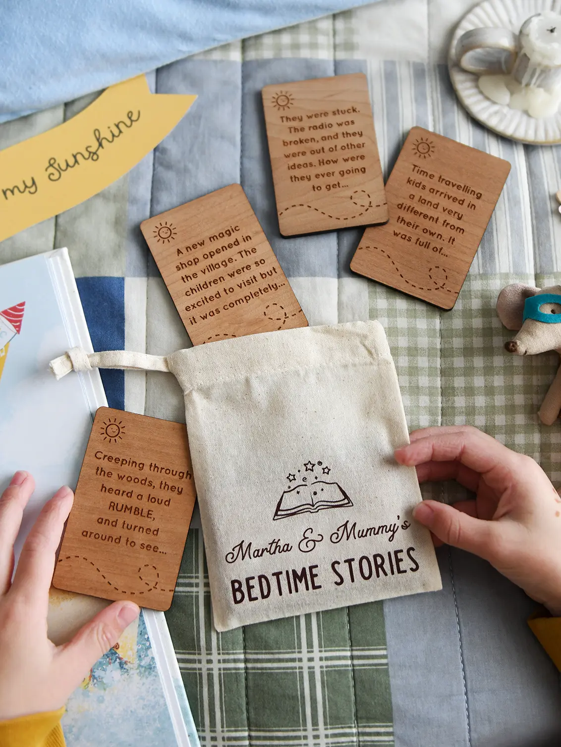 Tucked inside a soft personalised cotton bag are four engraved wooden story prompt cards designed to help dads and little ones create their own bedtime stories together.