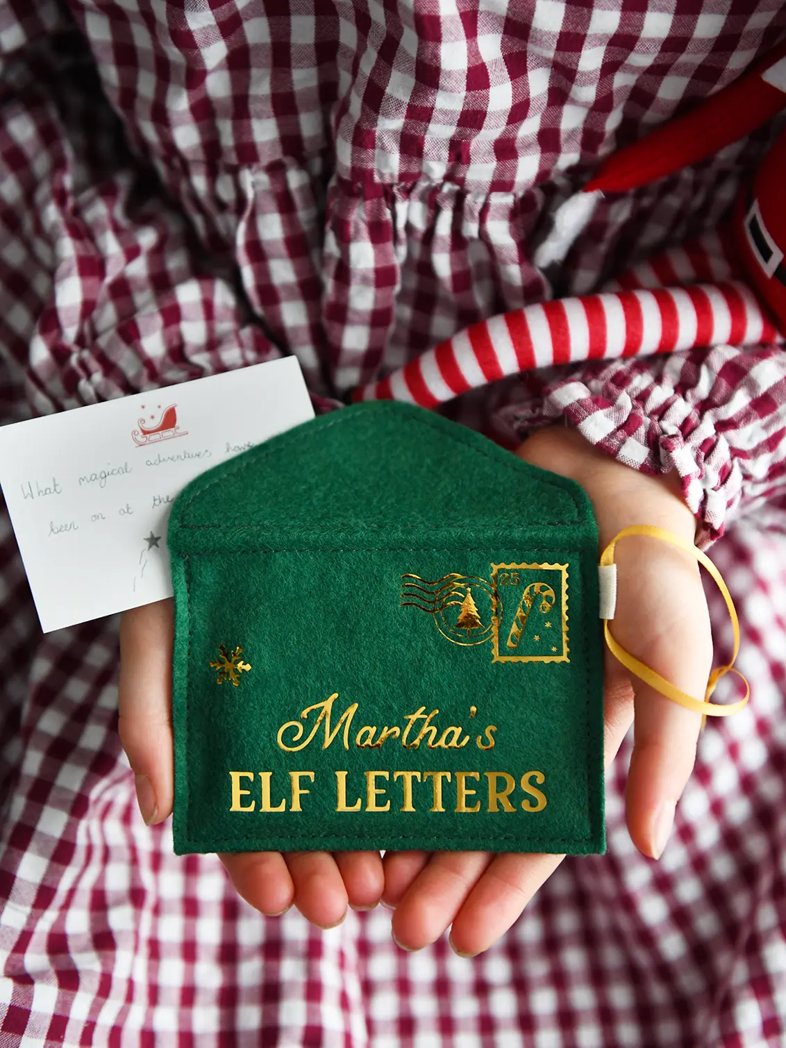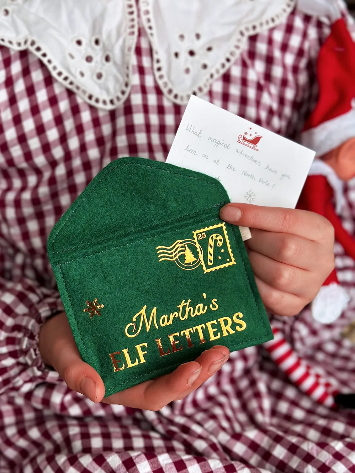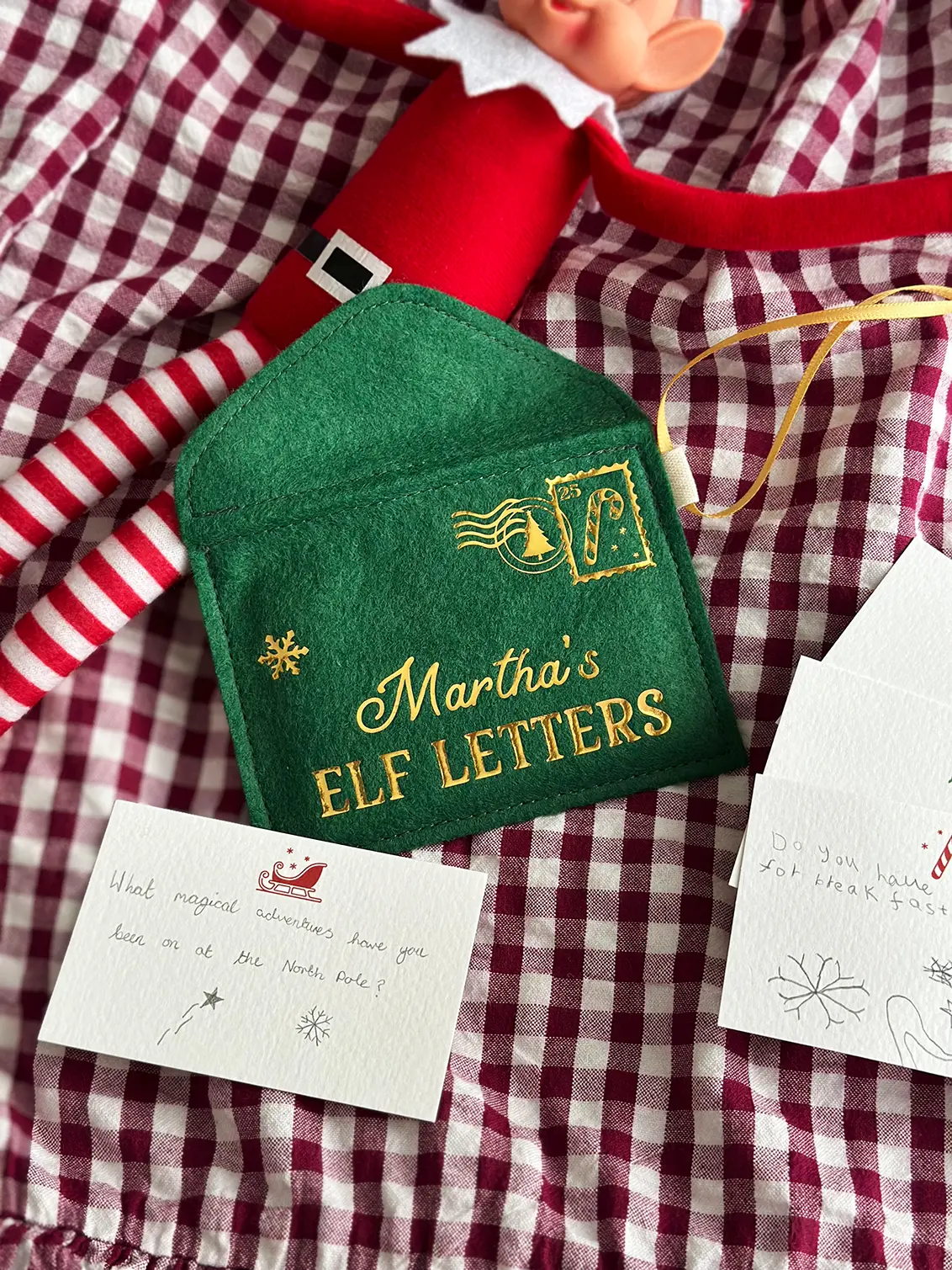 Each personalised Christmas Elf Letters envelope is beautifully handmade from heirloom-quality wool felt, finished with golden details, and a sprinkle of North Pole wonder.