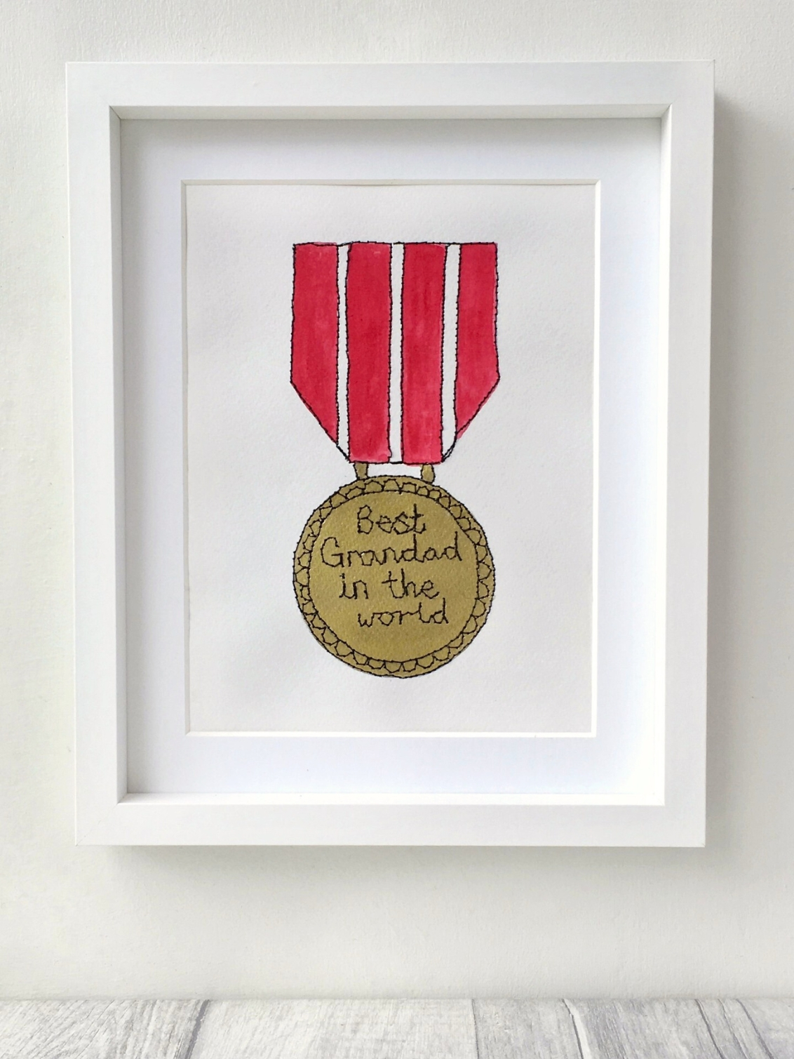 An original watercolour artwork featuring a hand painted metallic gold medal and coloured ribbon, personalised with your choice of achievement, using freehand machine embroidery...