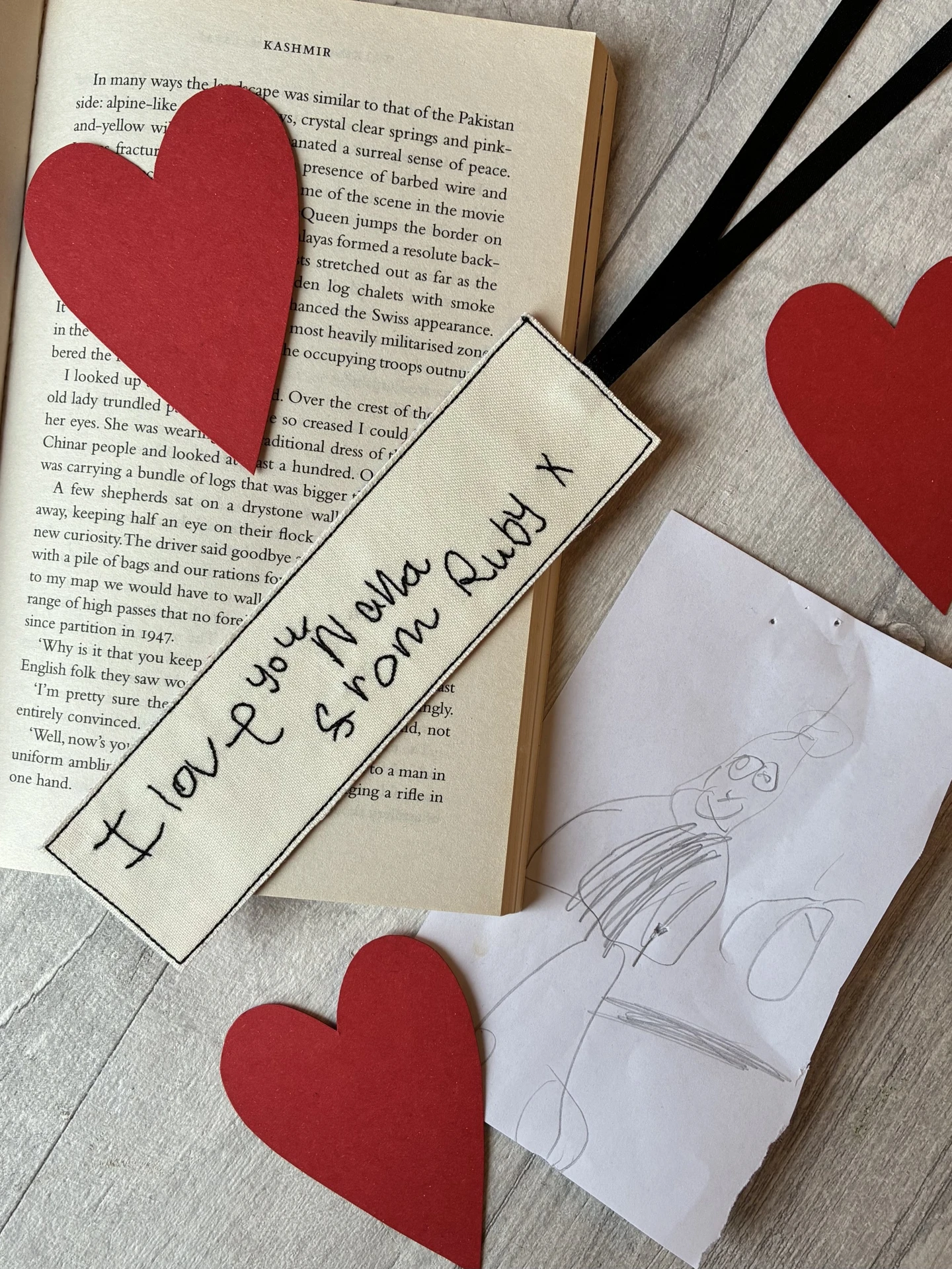 The bookmark is 16x4cm, not including the black ribbon, which is approx. 12cm long. The handwriting is sewn onto cream cotton fabric and is backed with natural linen.