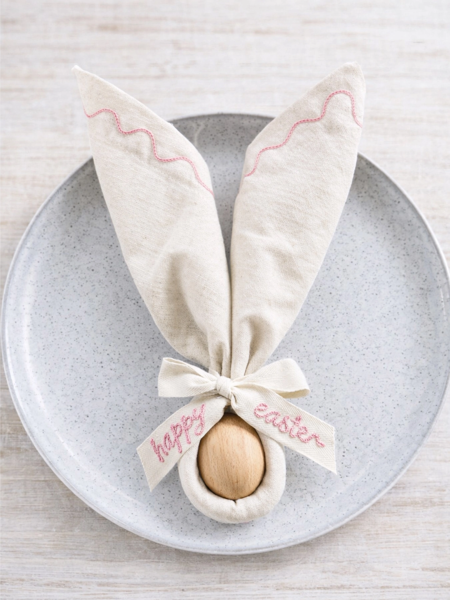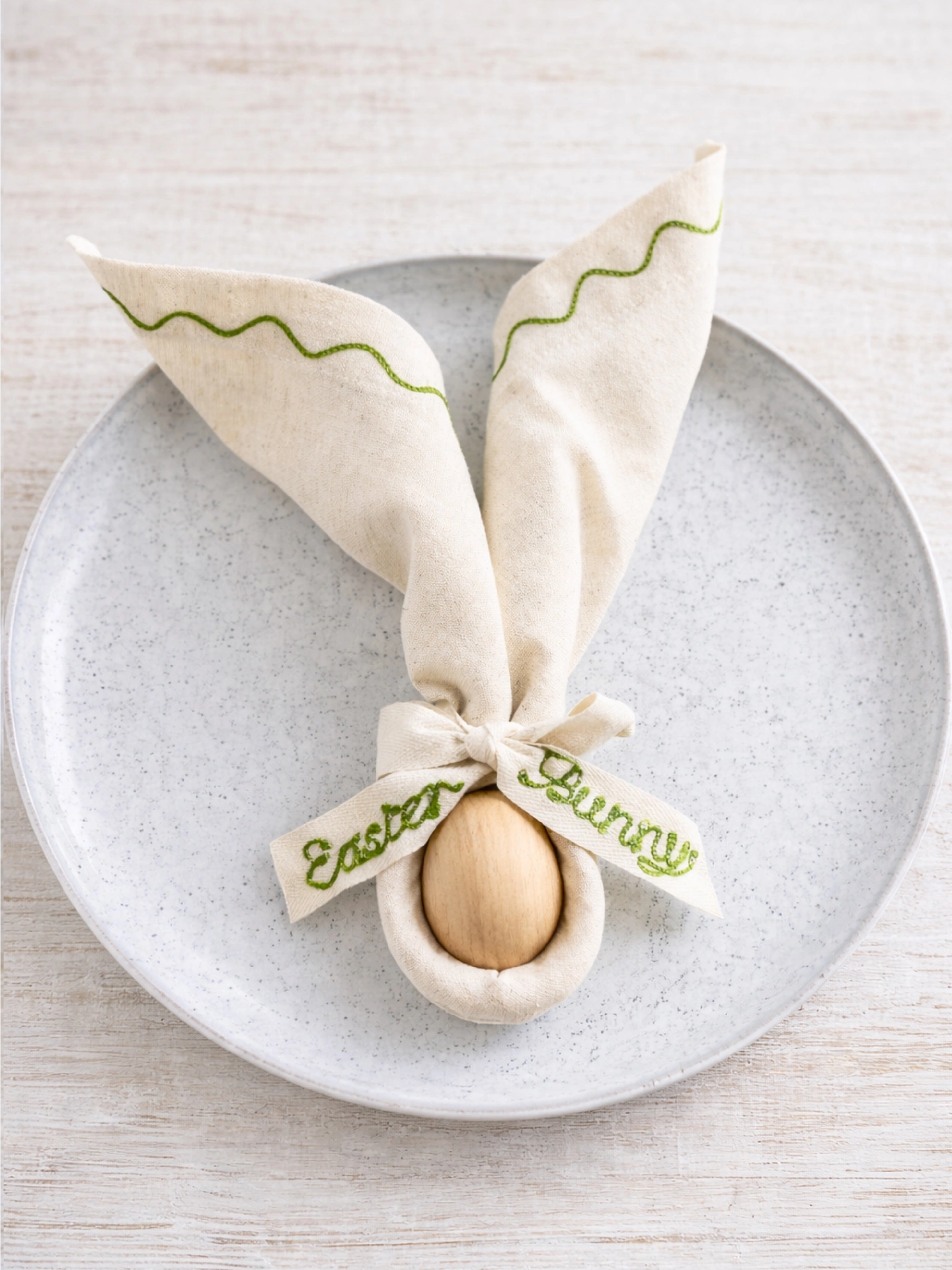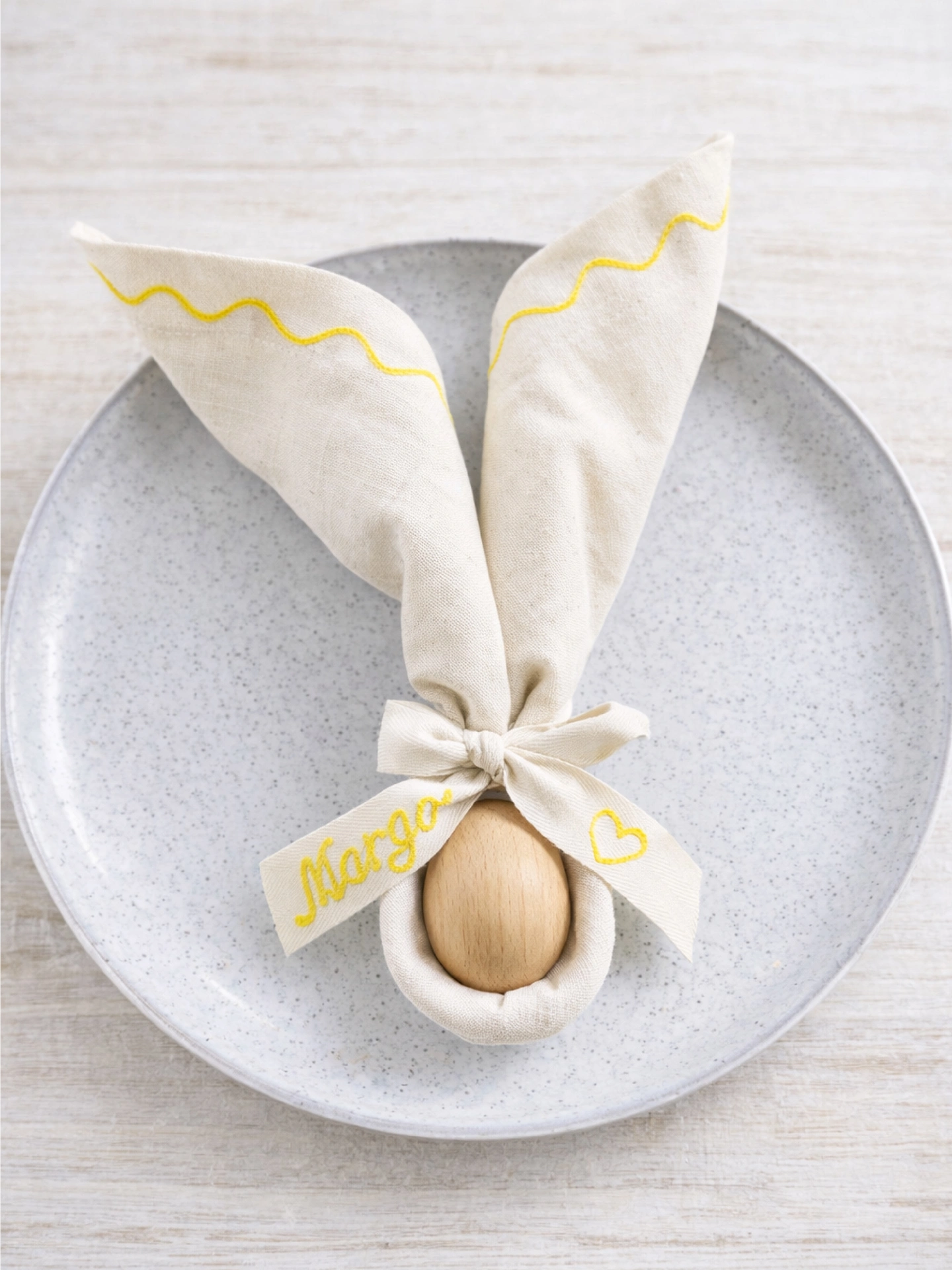 Each cotton twill bow is embroidered with your chosen name or short phrase, making every place setting unique and personal, perfect for welcoming guests to your Easter table.