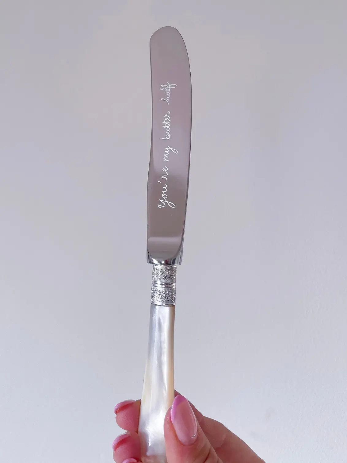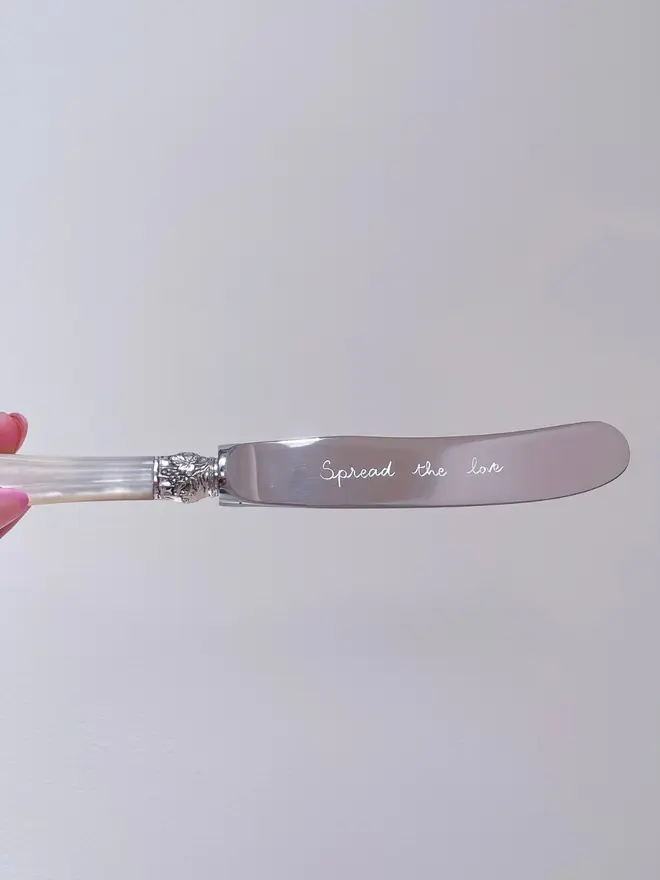 • Vintage Butter Spreader with a real mother of pearl handle, hand-engraved with the words of your choice on the blade