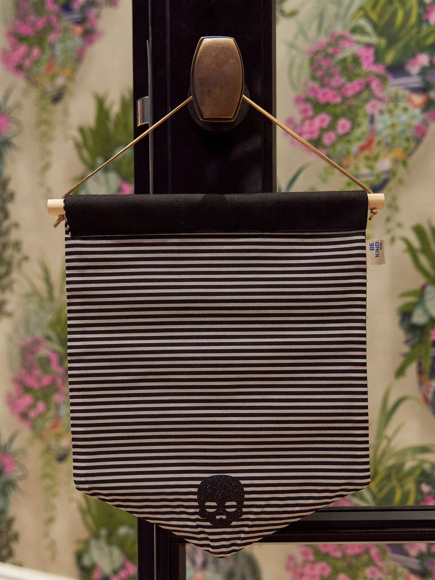 Black glitter printed onto a black cotton base, finished with a wooden dowel and vegan leather strap for easy hanging.