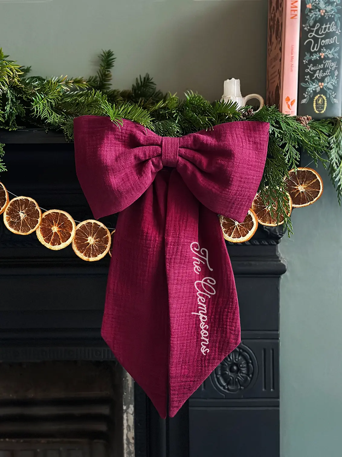 Every personalised bow decoration is lovingly handmade from soft double-gauze cotton in your choice of deep burgundy, forest green, or blush pink.