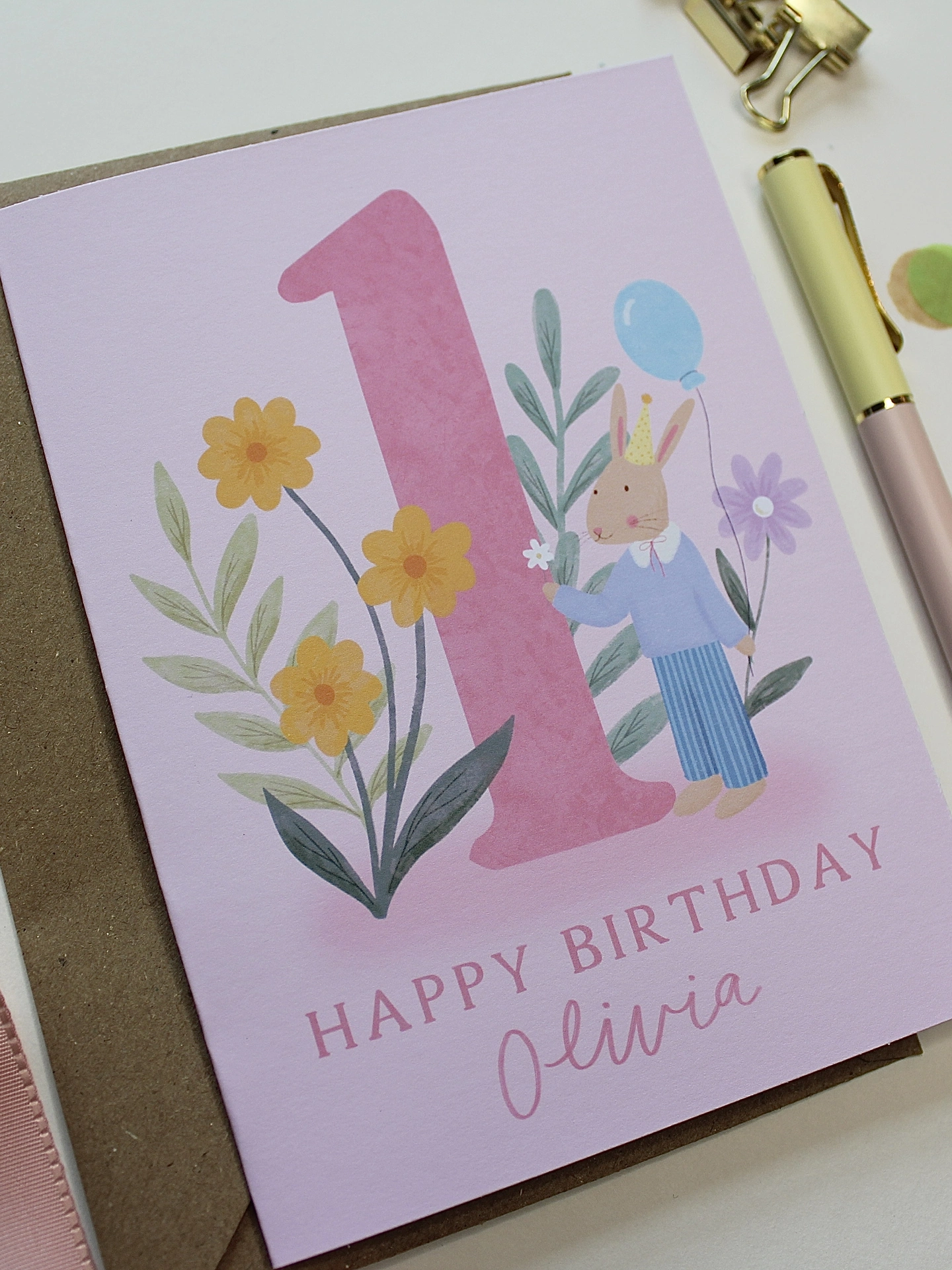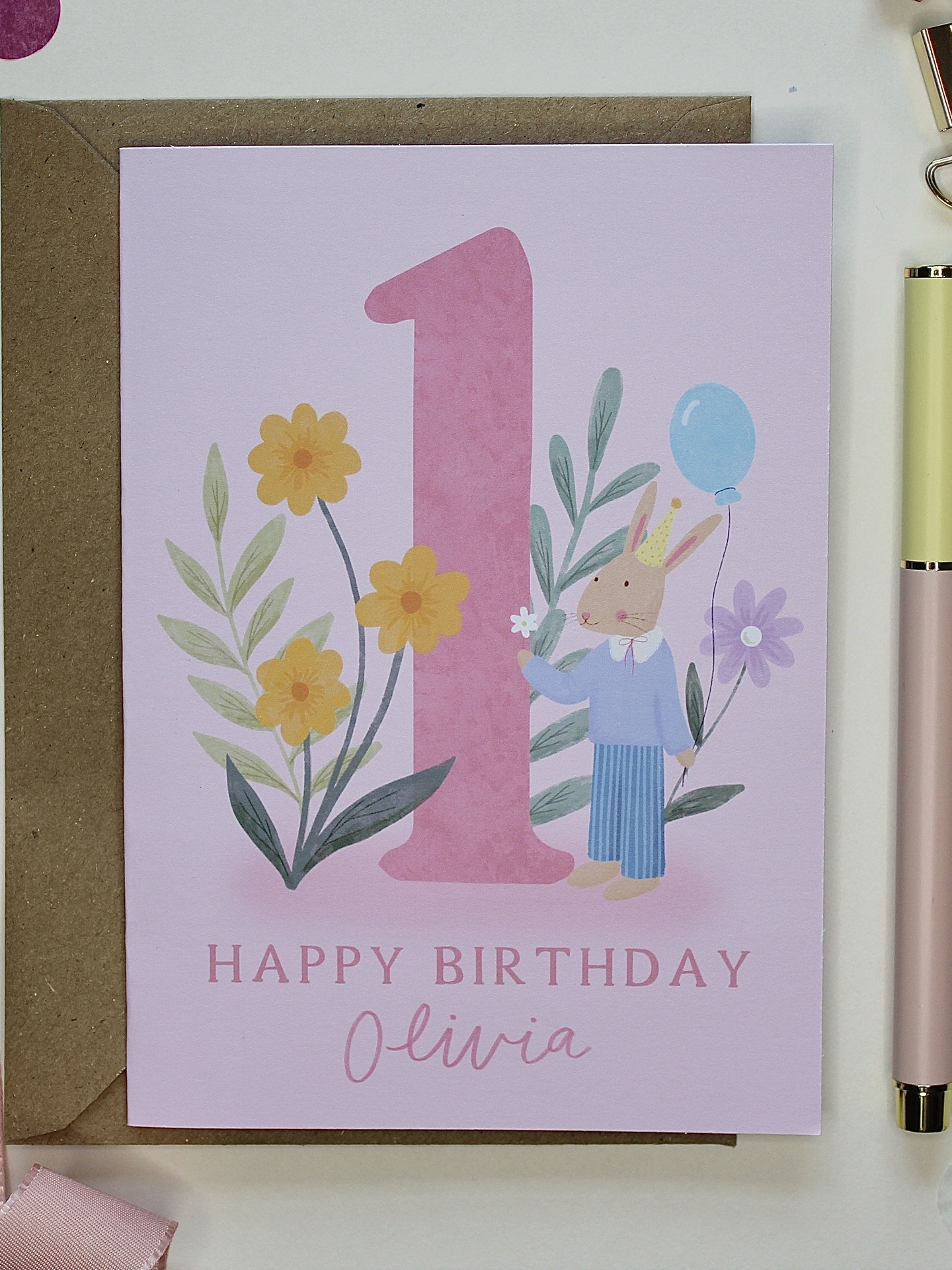 Make her first birthday extra special with this personalised greeting card featuring a cute bunny in front of a big number 1. Delicate pink flowers climb the side, adding a whimsical, floral touch. Add the birthday girl's name for a unique keepsake she'll...