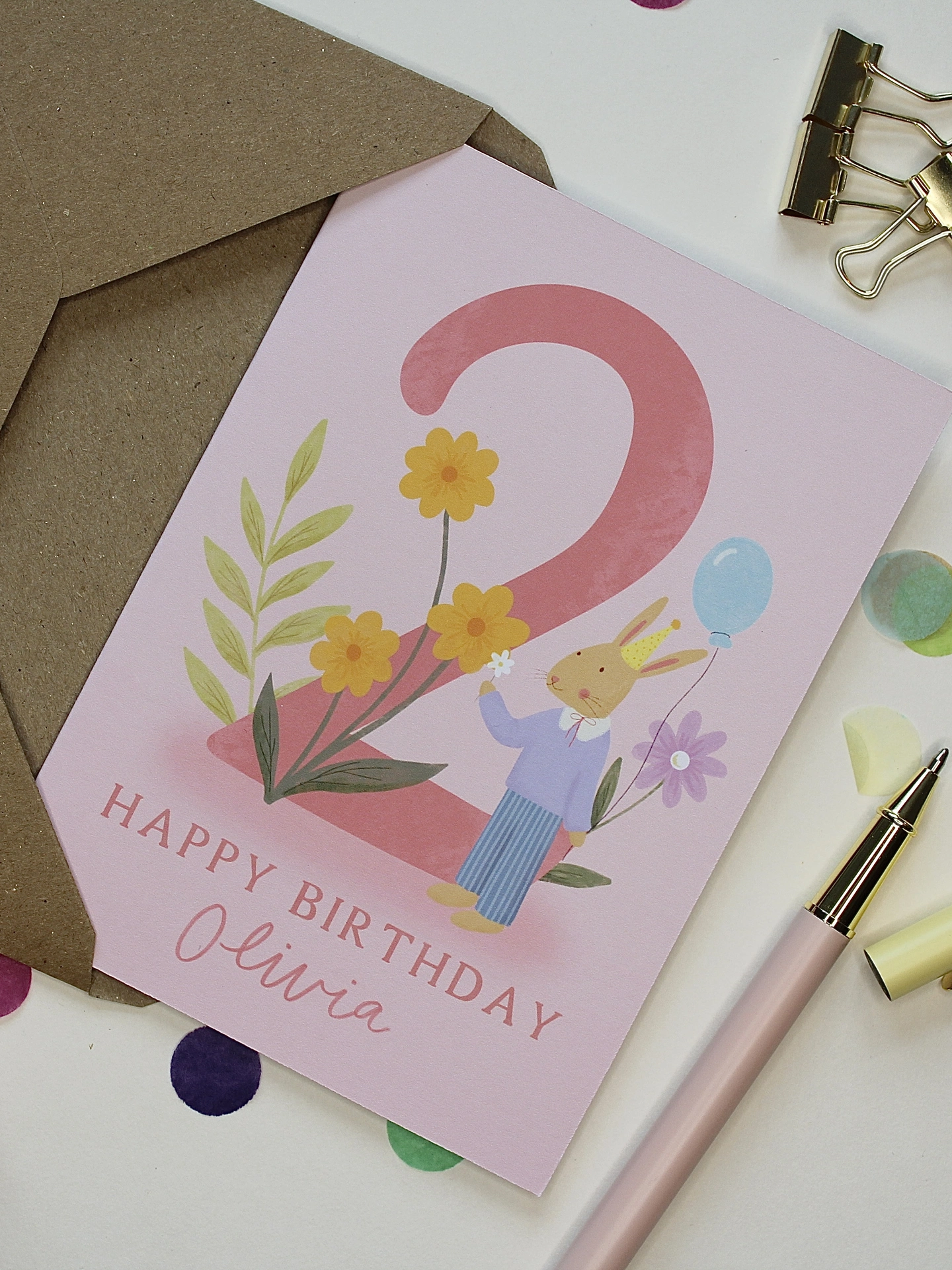 Make her second birthday extra special with this personalised greeting card featuring a cute bunny in front of a big number 2. Delicate pink flowers climb the side, adding a whimsical, floral touch. Add the birthday girl's name for a unique keepsake she'l...