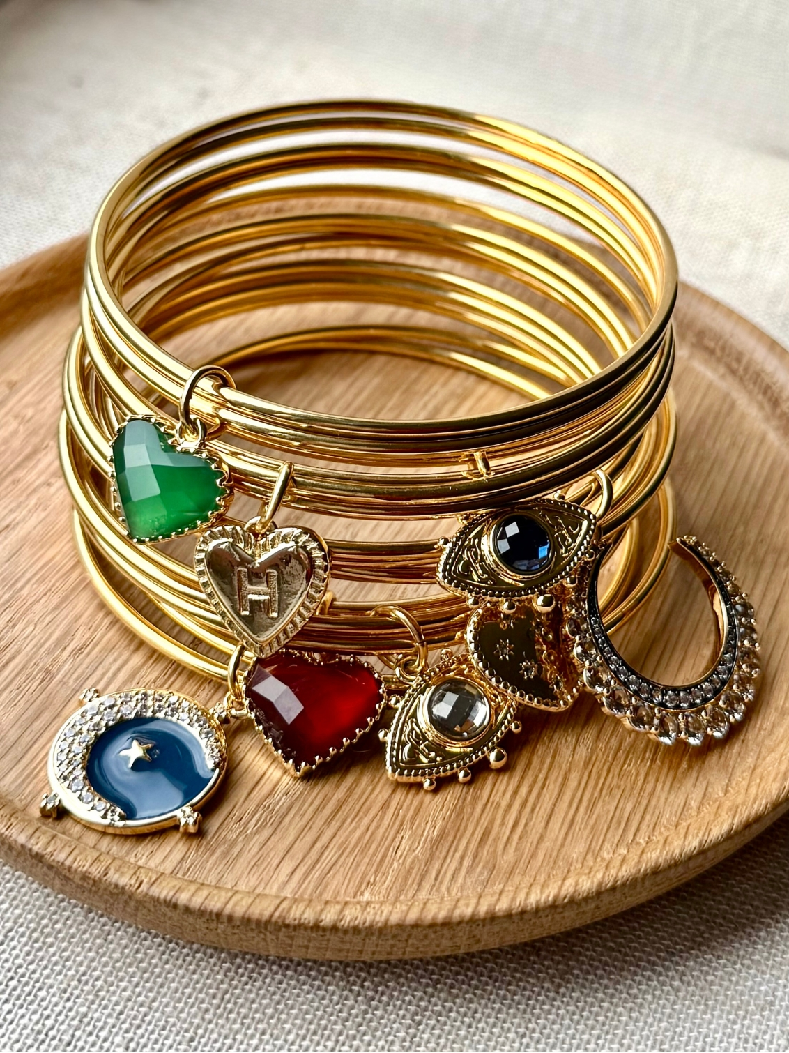 A pair of fine gold bangles hung with the heart initial charm of your choice, ready for you to add the talisman charm that speaks to your spirit and individuality. This bangle is more than jewellery, it’s a quiet reminder of who you are, what you’ve overcome, and the magic you carry within.