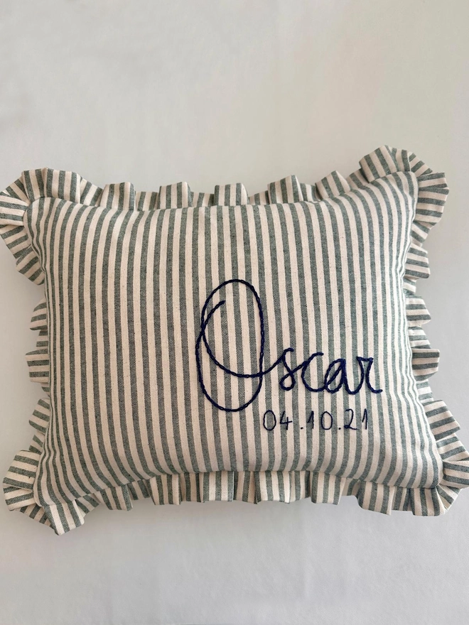 Cream Stripe fabric to the front and back of this 45cm x 35cm cushion with frill and zip opening...