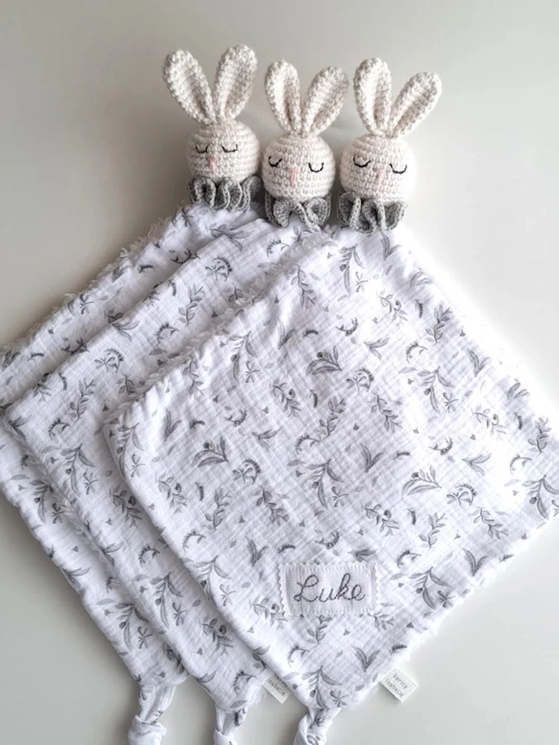 The blankie itself features a lovely pale grey and white, botanical print cotton gauze on one side and an ultra-soft white teddy fleece on the other, designed for tiny hands to grasp and hold close. For added convenience, it includes a small tie to securely attach baby’s pacifier or dummy, keeping comfort close at hand.