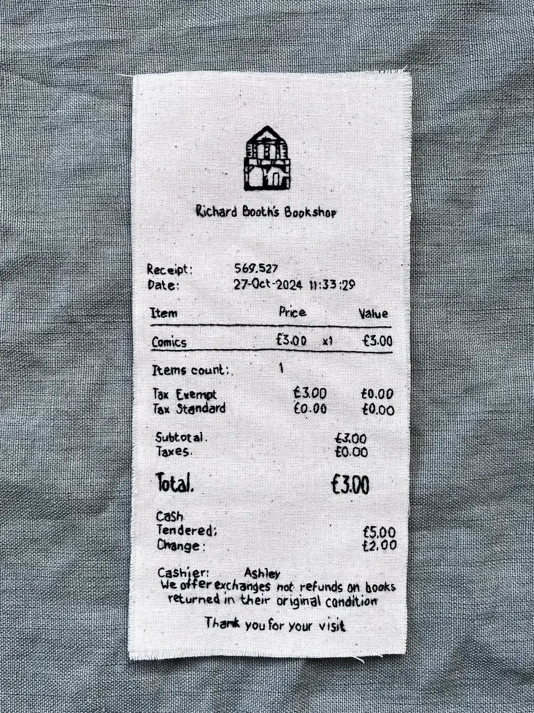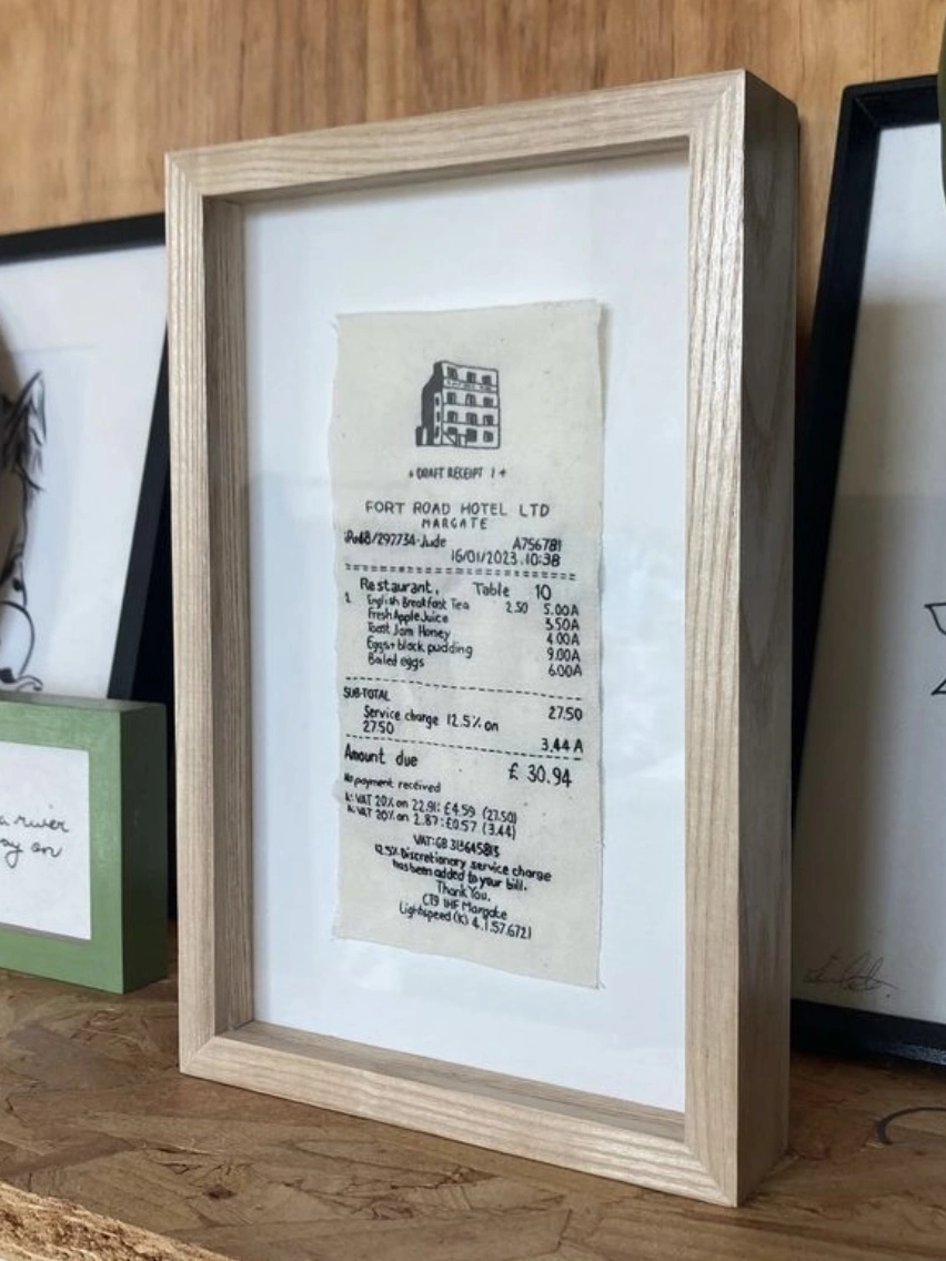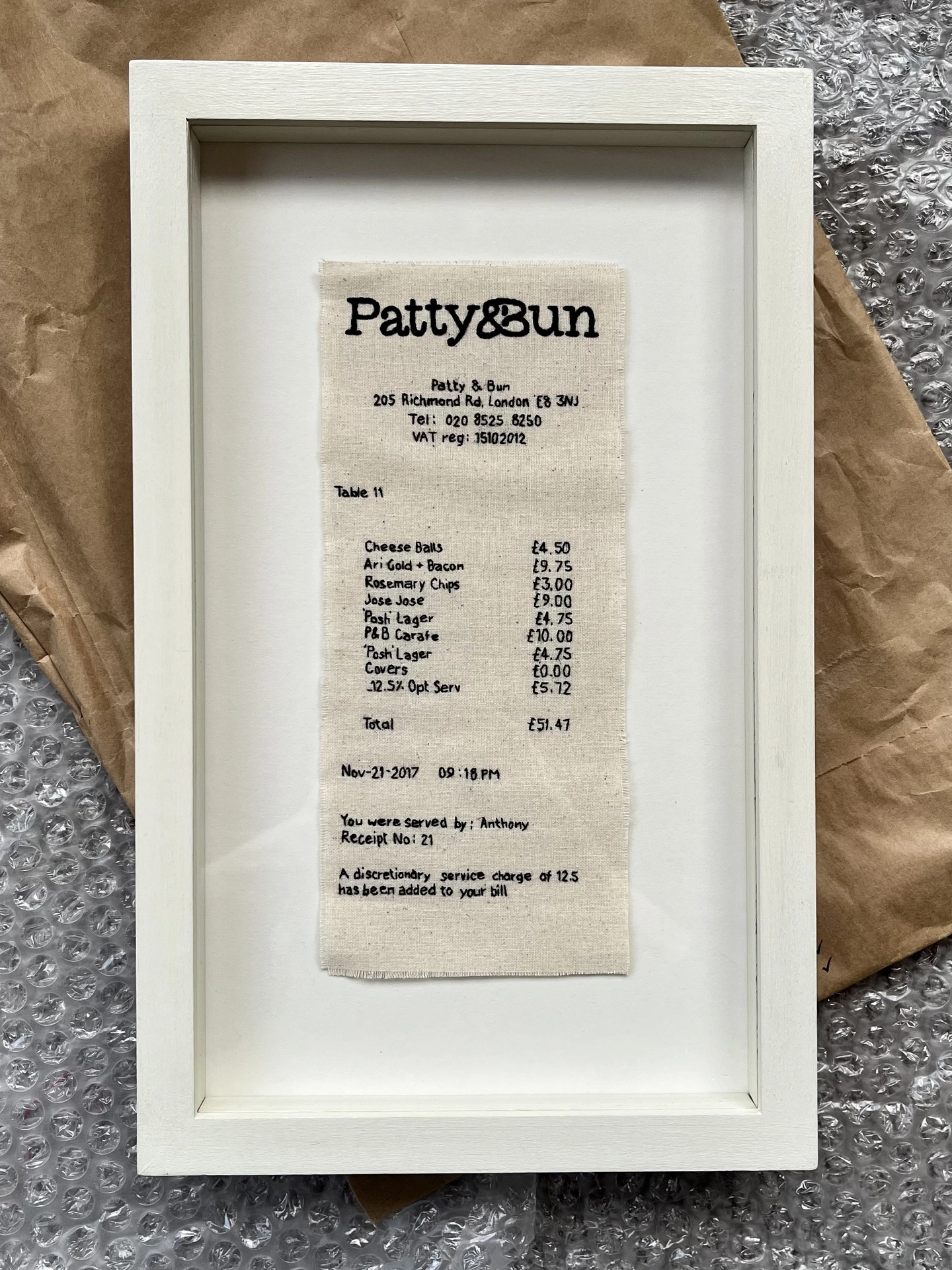 A bespoke hand embroidered artwork depicting a receipt of your choosing...