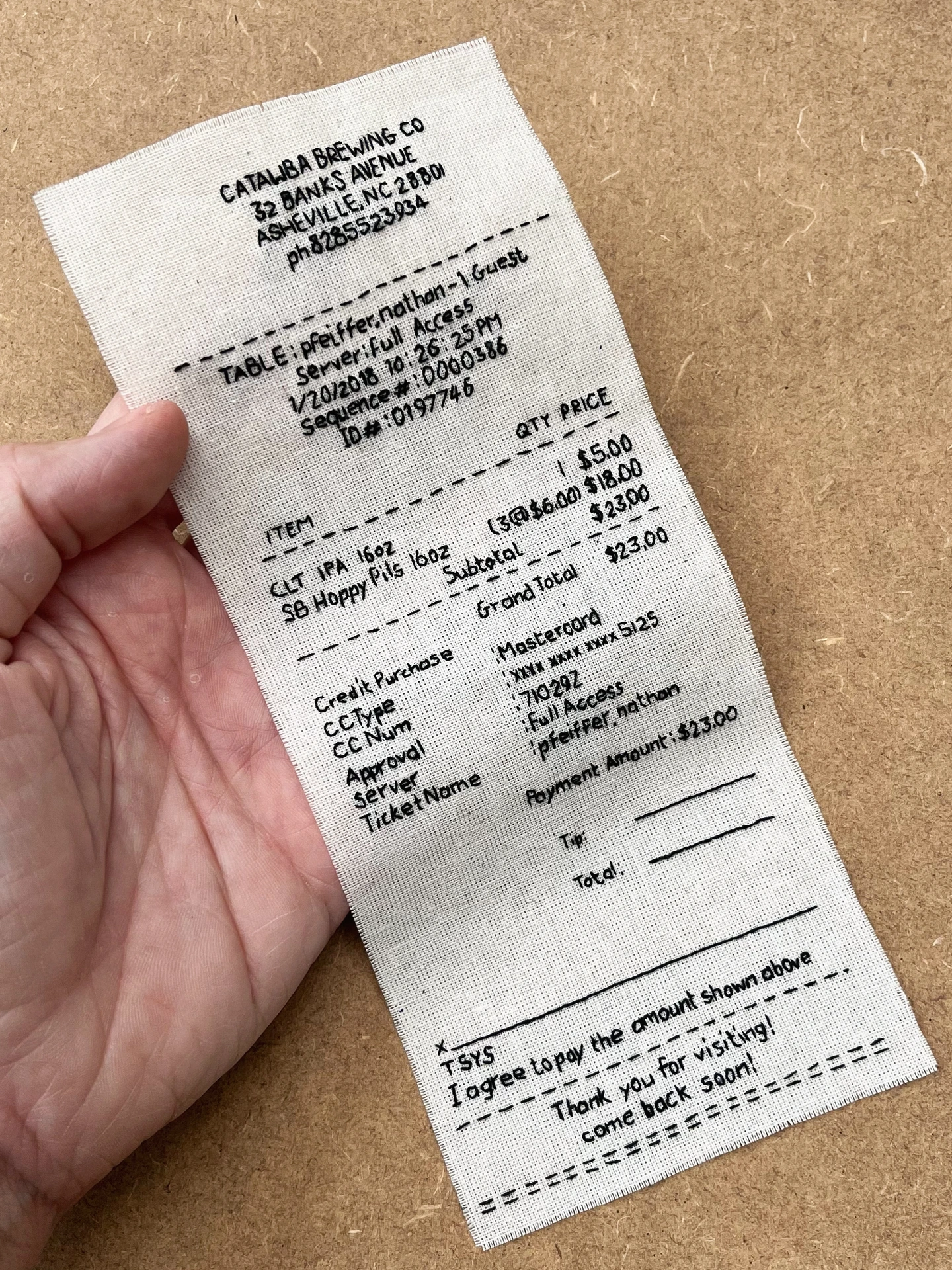 A bespoke hand embroidered artwork depicting a receipt of your choosing.