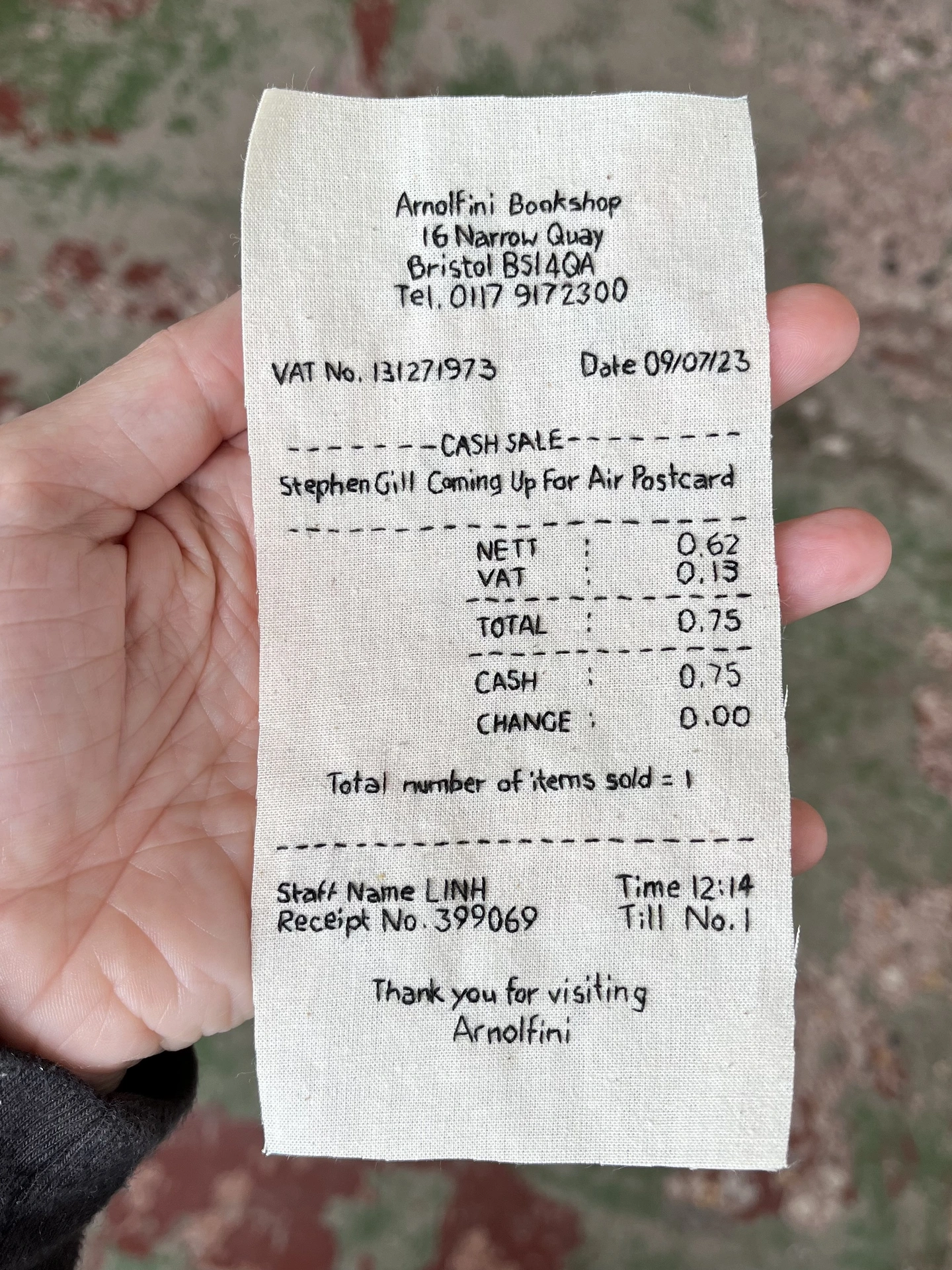 The receipt is rendered in cotton thread on natural cotton calico, and framed in a handmade oak frame with off- white mount. The artwork is invisibly secured to the mount, giving the illusion that it is floating naturally.