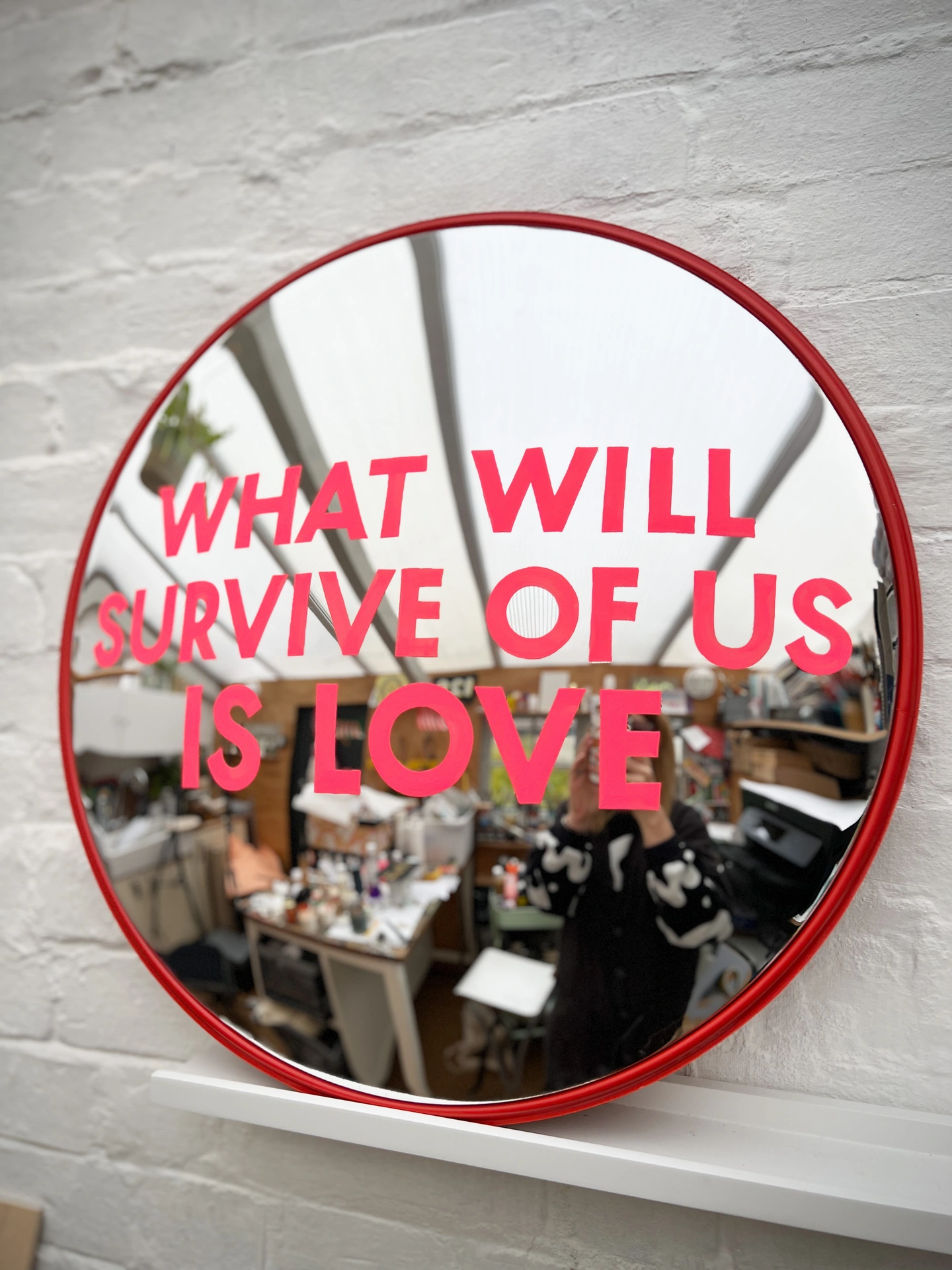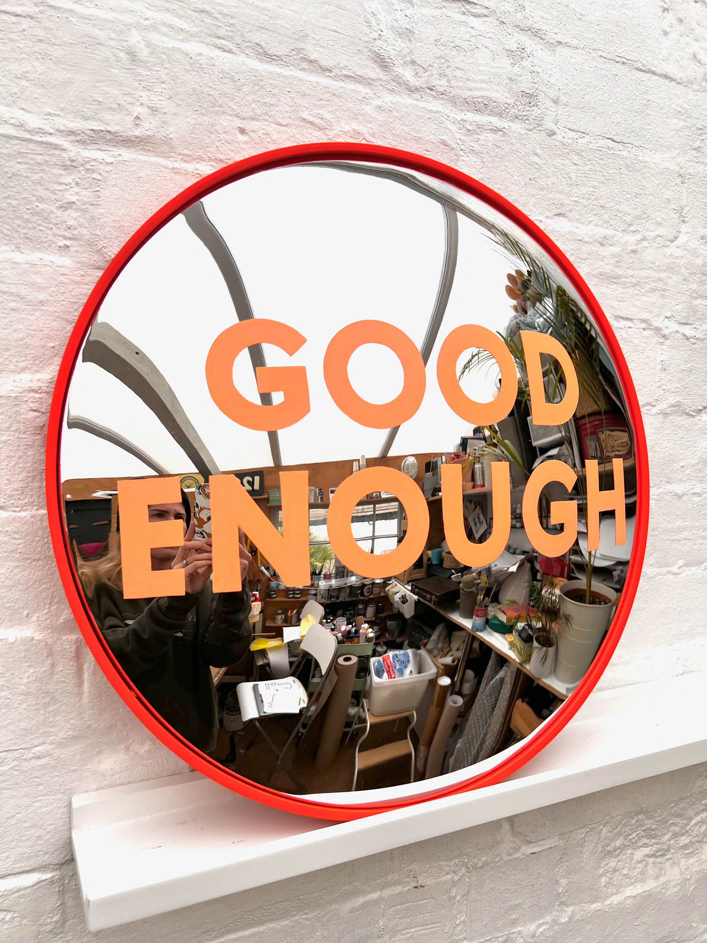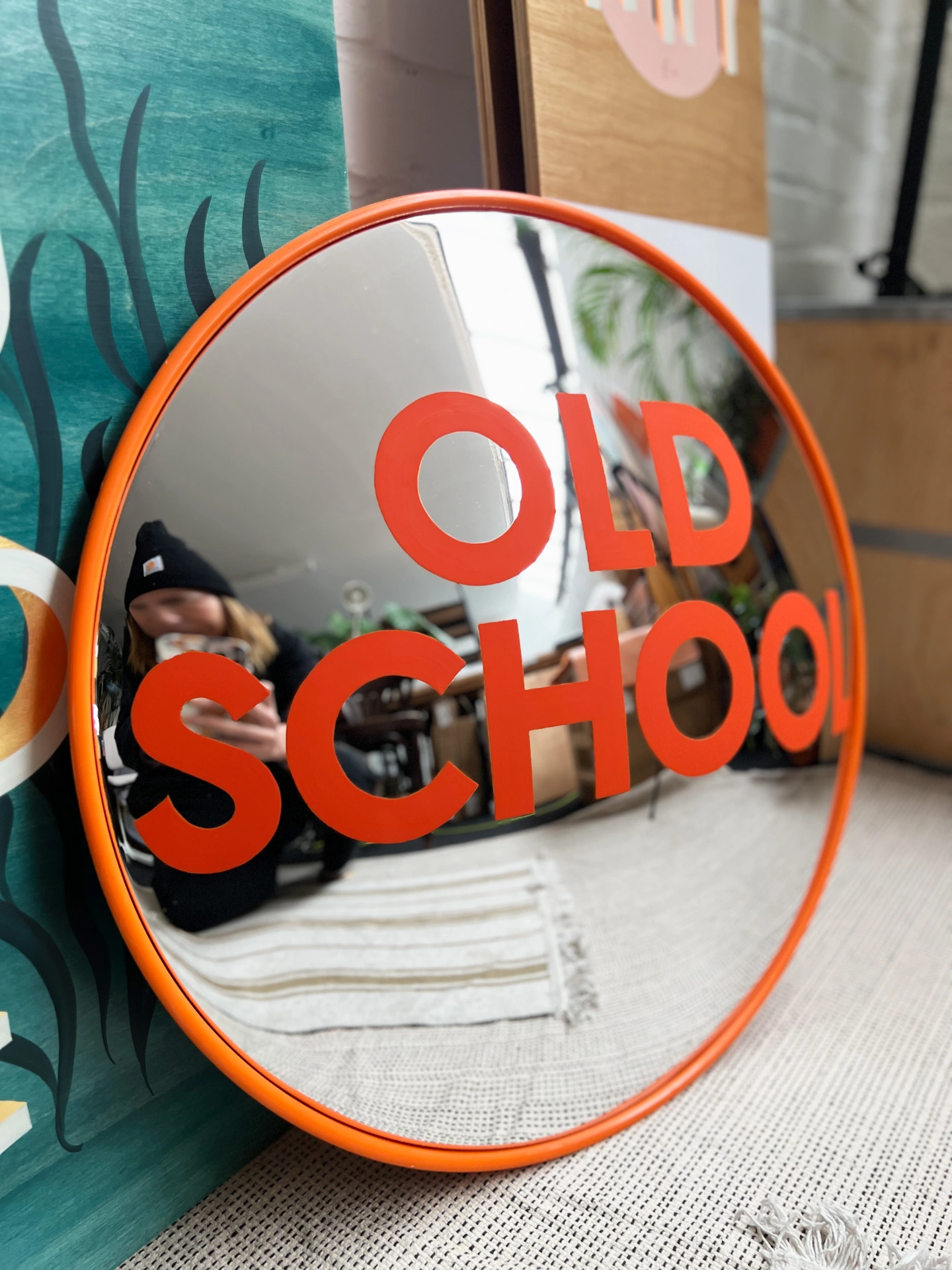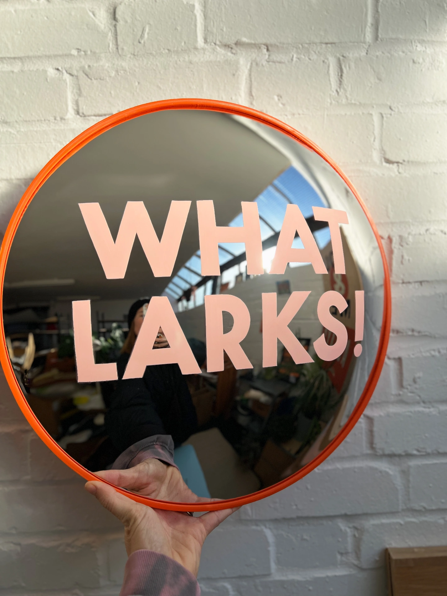 This hand-painted convex mirror offers a blend of function, craftsmanship and subtle character. Re-imagining the ubiquitous orange road mirror, it marries function with cheeky, bold design.
