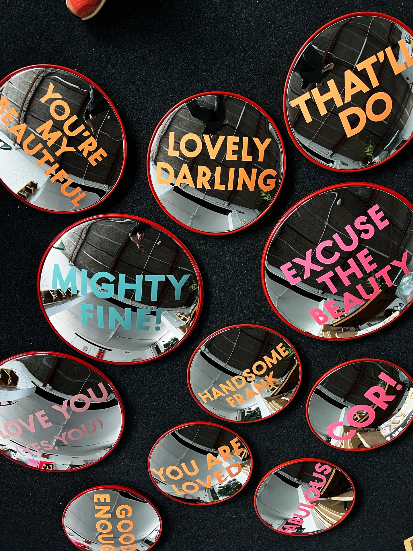 This hand-painted convex mirror offers a blend of function, craftsmanship and subtle character. Re-imagining the ubiquitous orange road mirror, it marries function with cheeky, bold design...