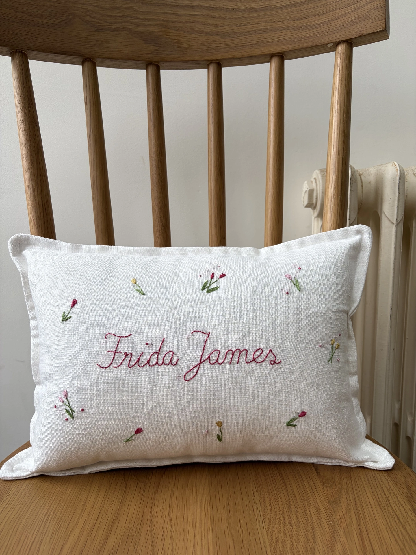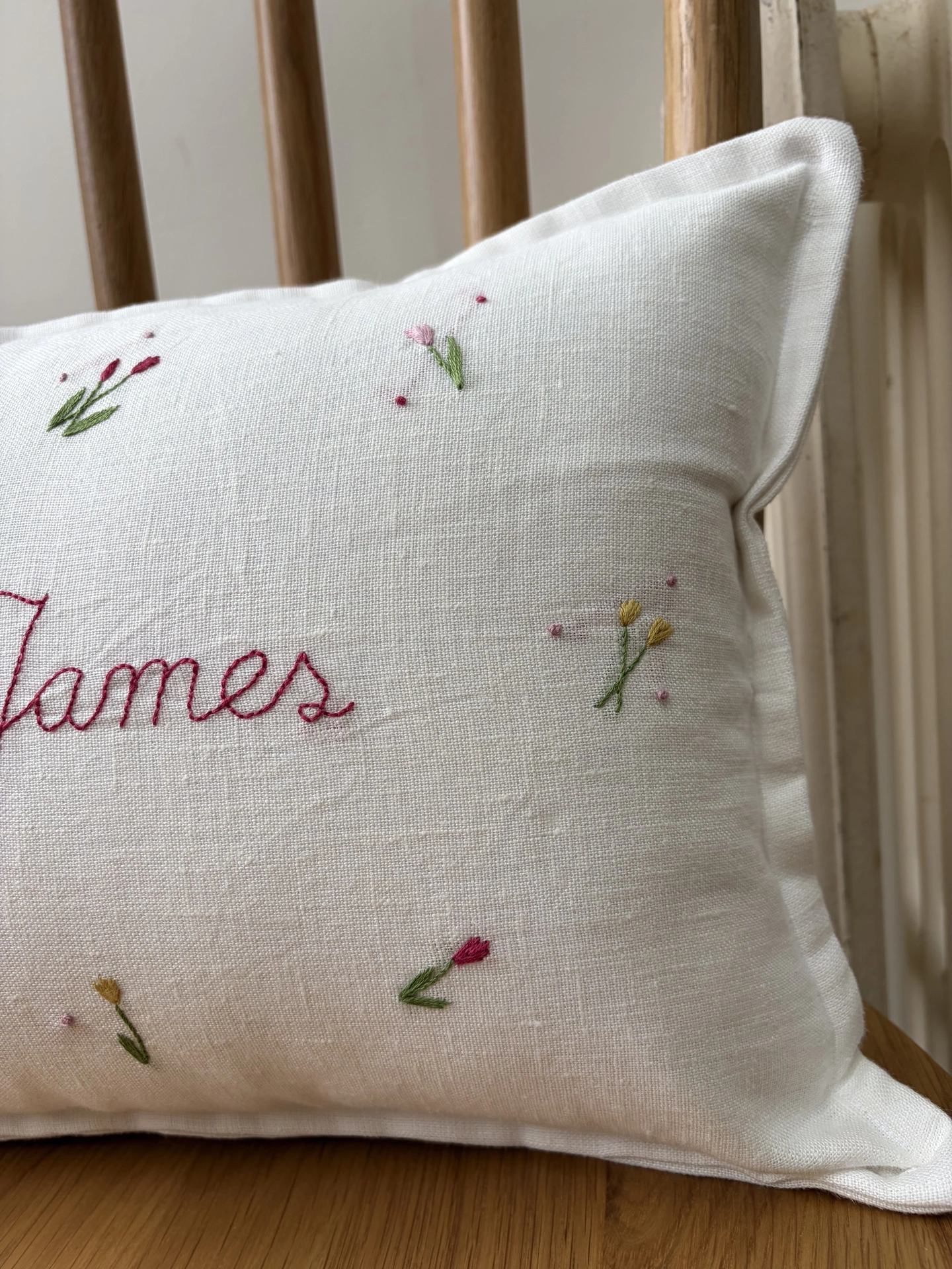 A truly meaningful keepsake – each cushion is handmade, hand embroidered, and personalised with a name, birth date and flowers and buds.