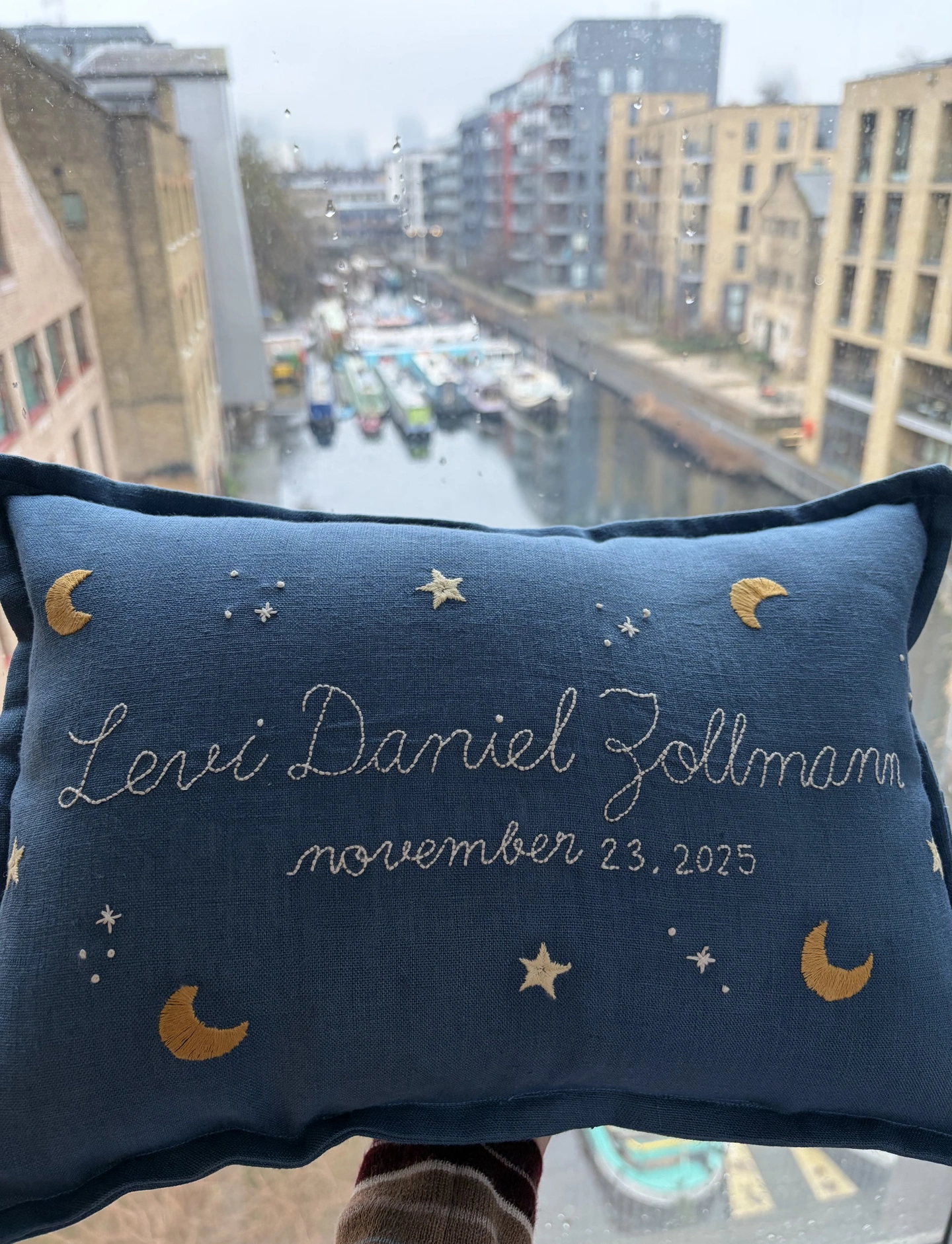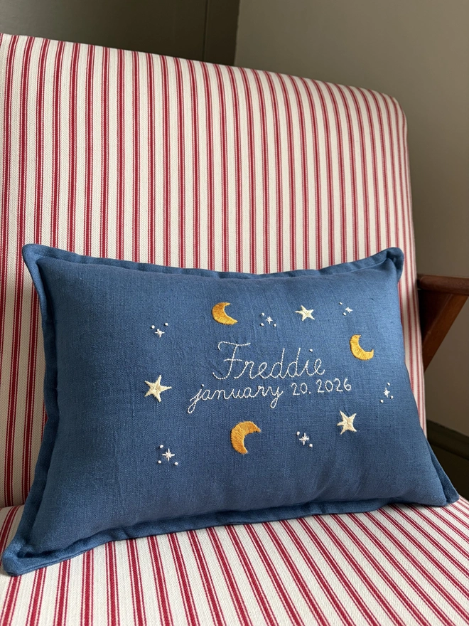 A truly meaningful keepsake – each cushion is handmade, hand embroidered, and personalised with a name, birth date and moon & stars motif.