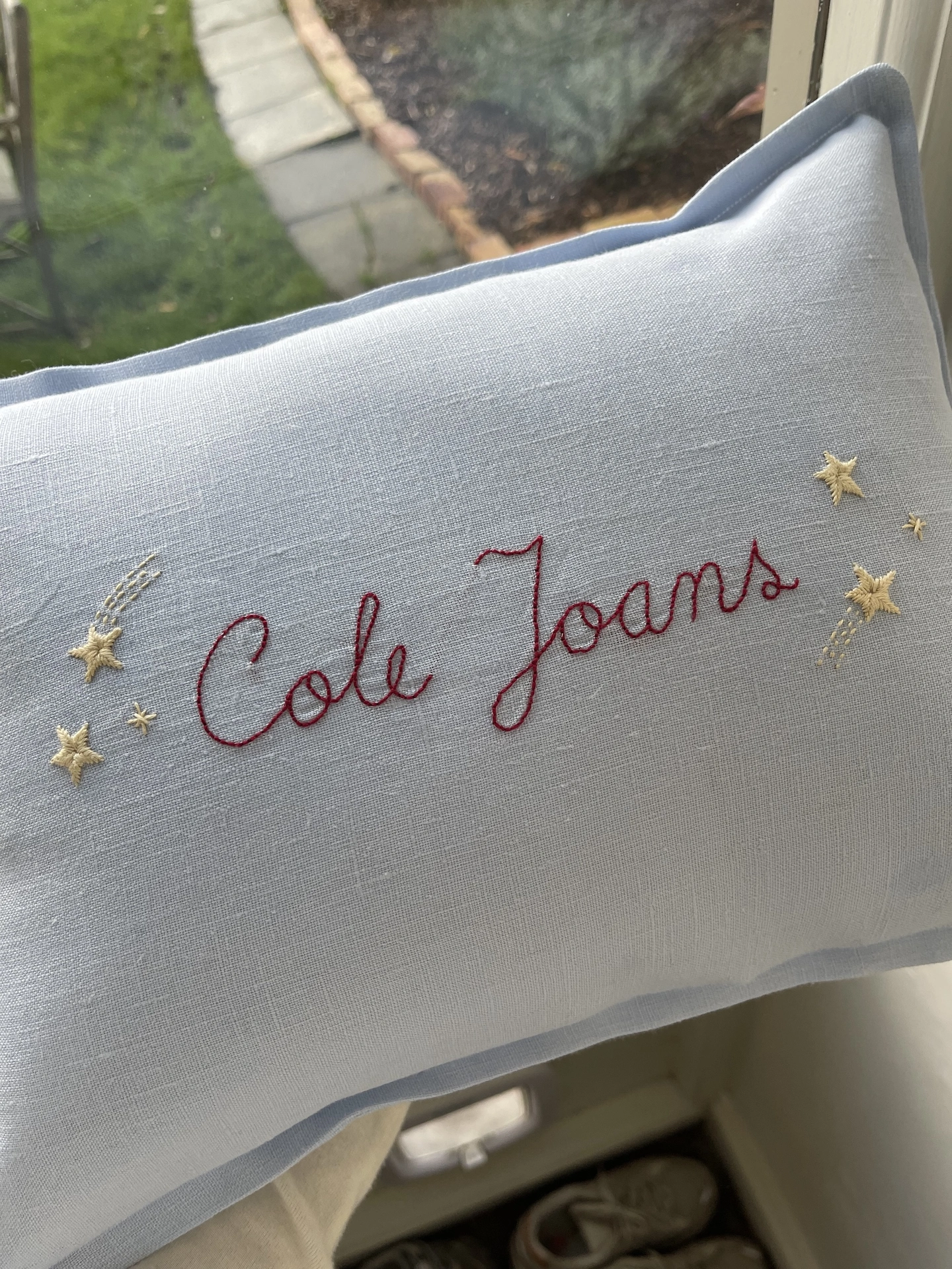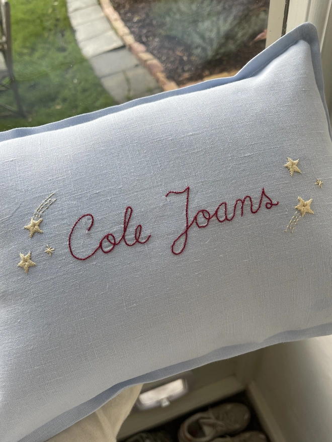 Personalised Handmade Embroidered Linen Cushion With Stars