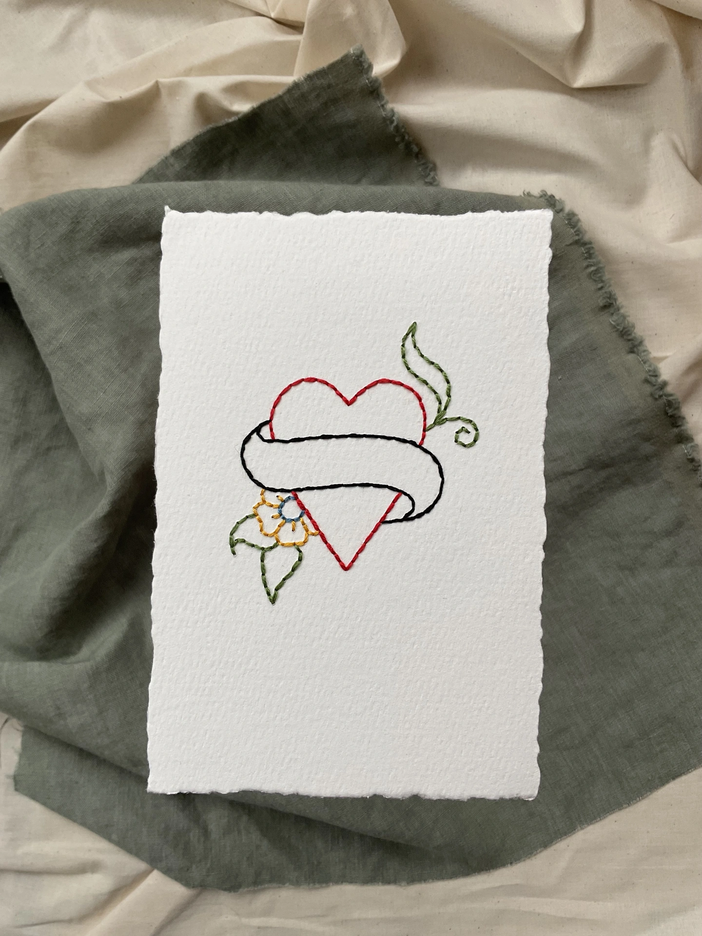Hand embroidered artwork, stitched with cotton on thick, textured khadi paper with deckled edge.