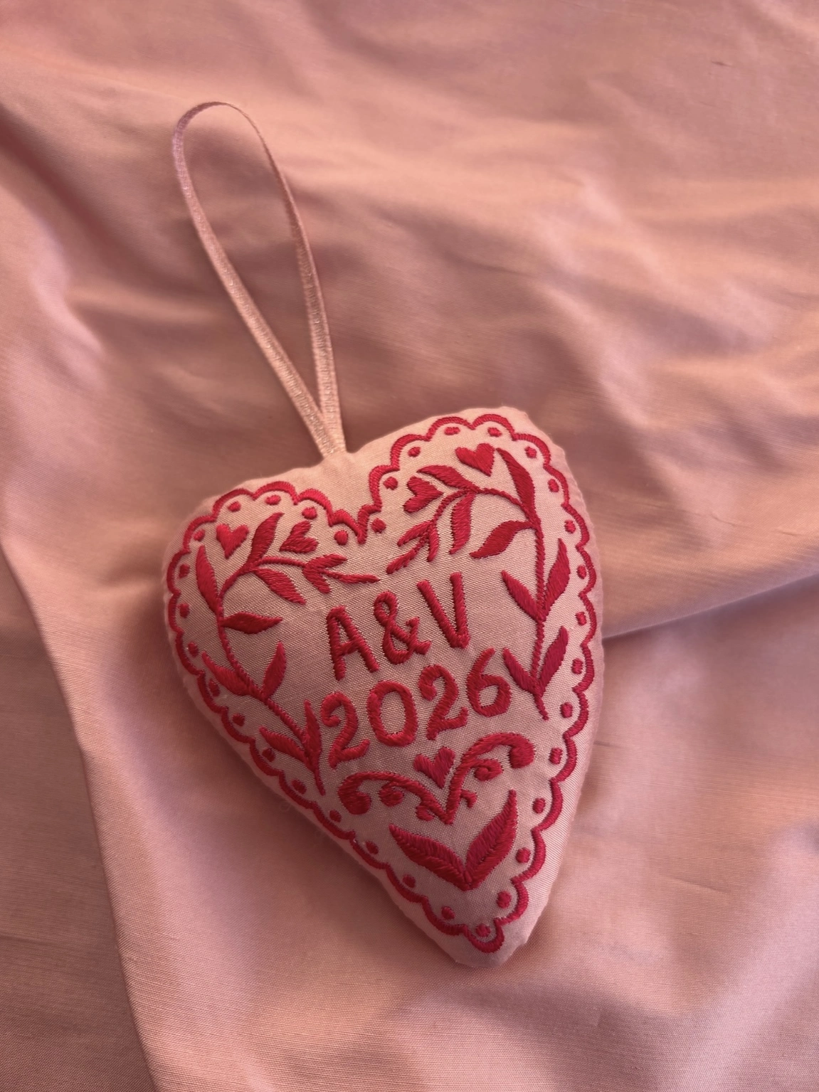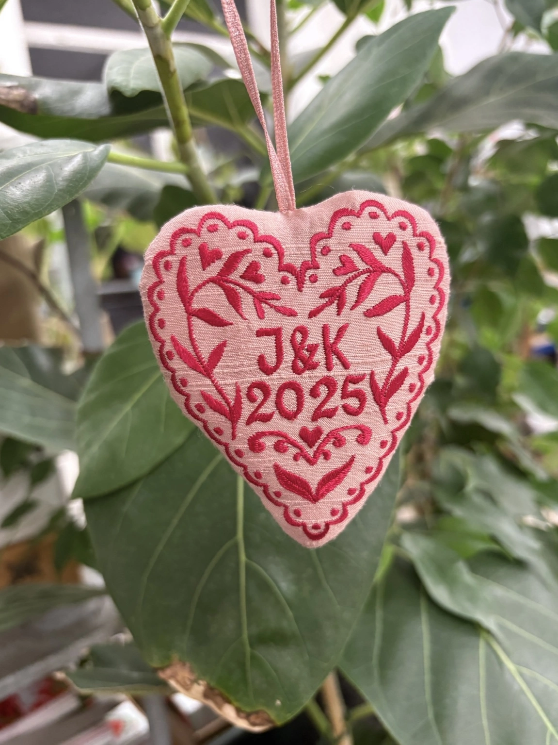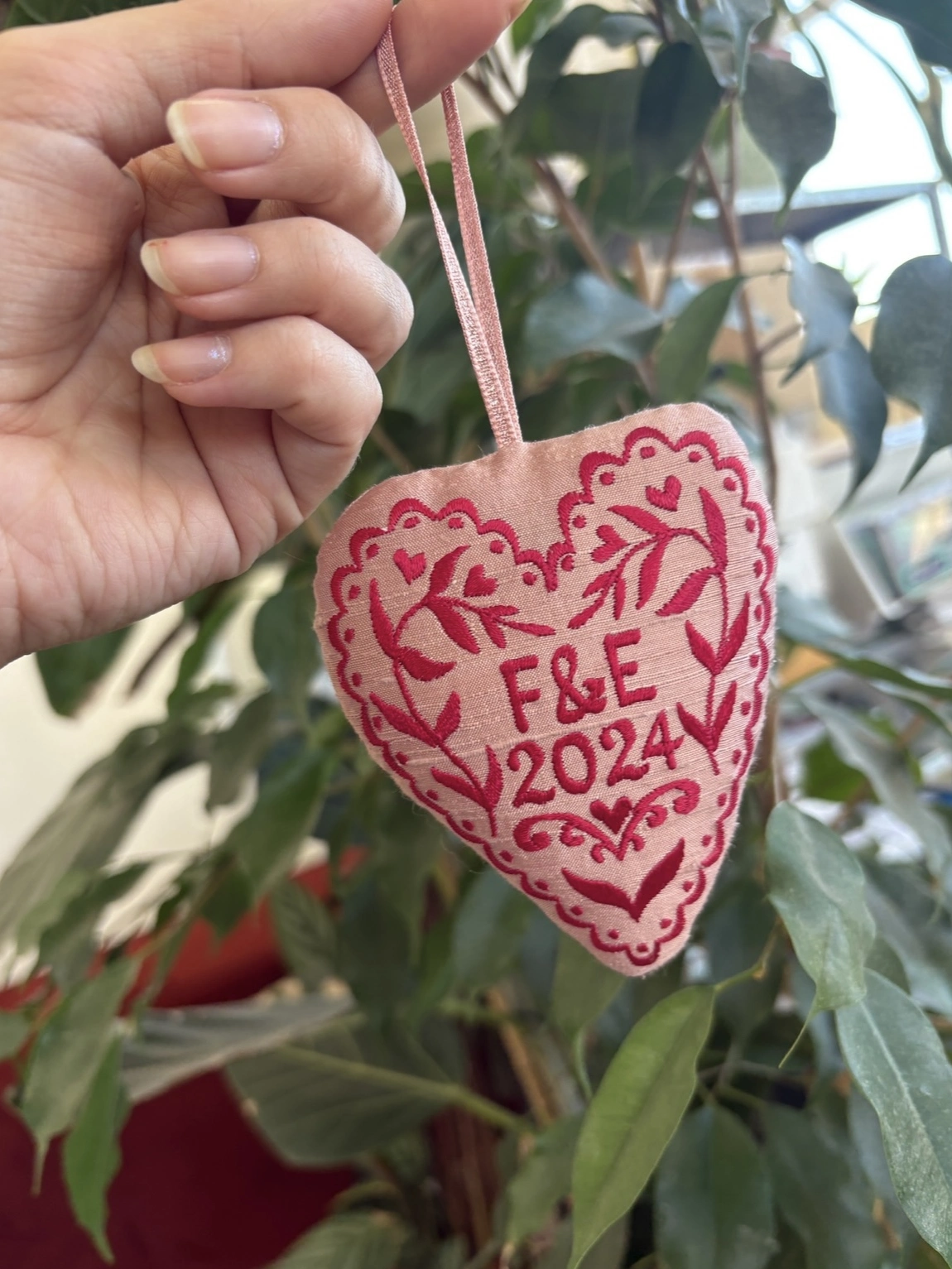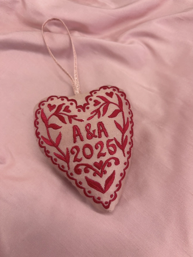 A freehand embroidered dupion silk heart ornament! With custom initials and year, made to order.