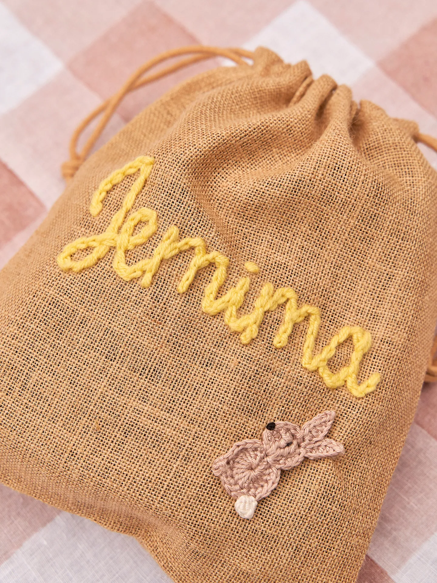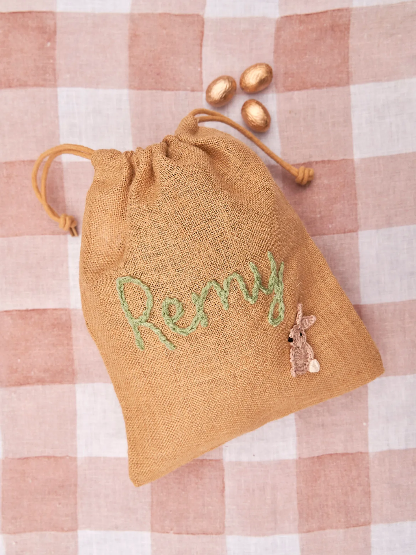 Personalised Easter sacks with knitted name and bunny.