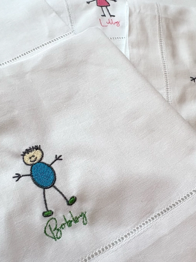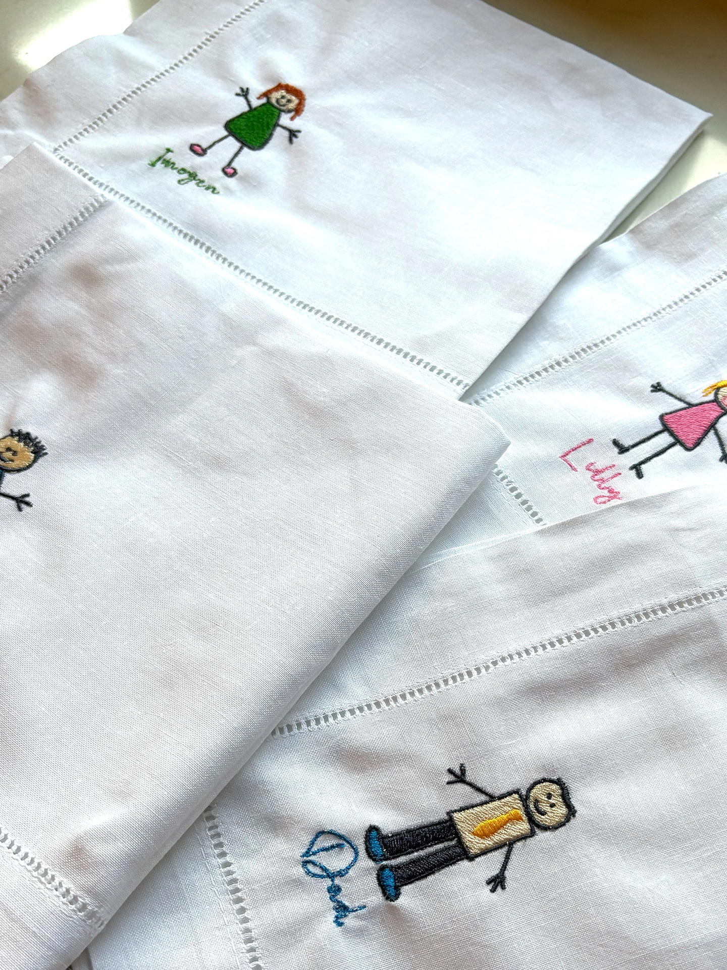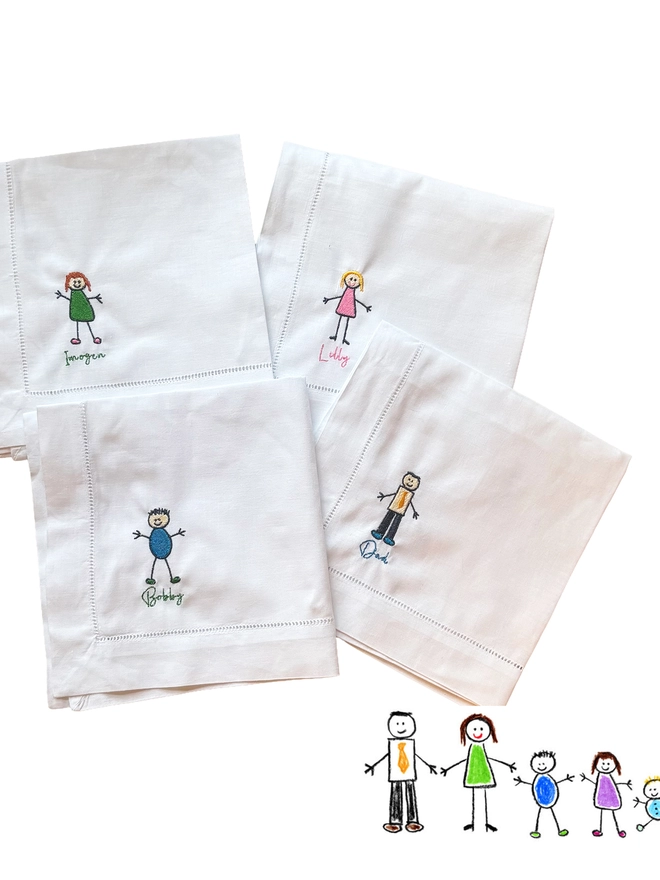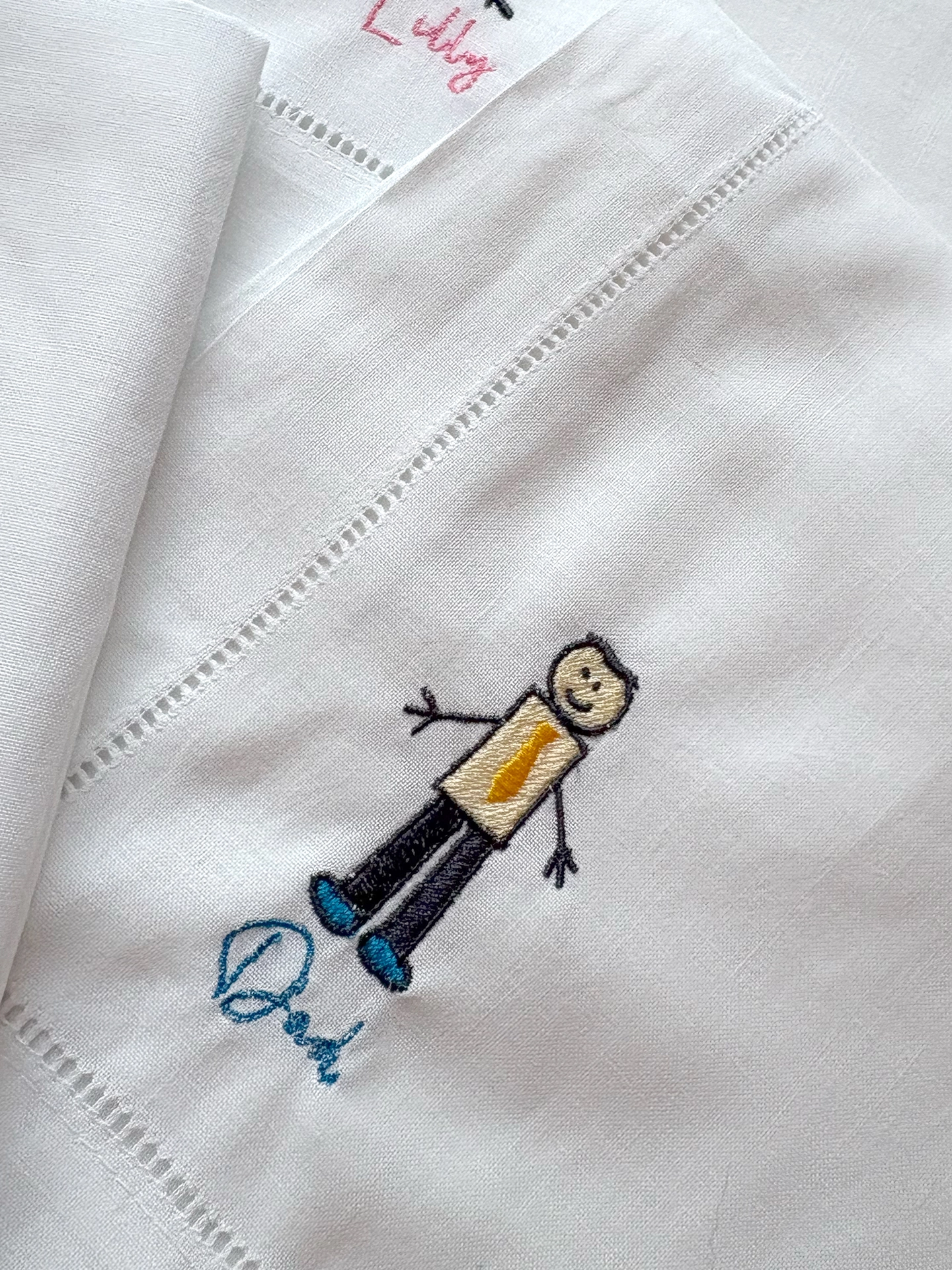Give a personal and thoughtful gift to mum/dad/grandparents/friends, by uploading a scanned photo of your child's drawing, and getting it embroidered onto your napkins!