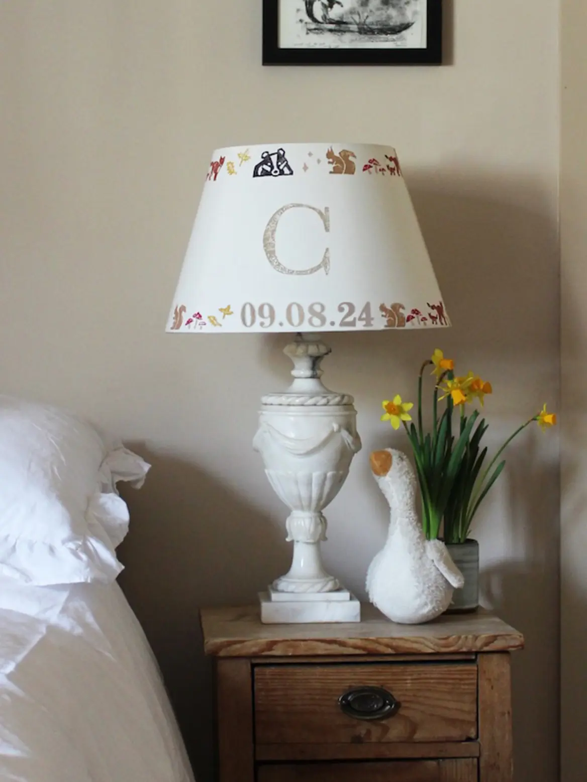 Add thoughtful detail and artistry to your child’s decor with the Kids Countryside Lampshade, an empire-style lampshade that brings countryside charm indoors. Each piece is handmade in the UK using cream card, hand-printed in the Cotswolds capturing subtle variations—making every shade completely unique. Personalise it with an initial and date to create a treasured keepsake that grows with them.