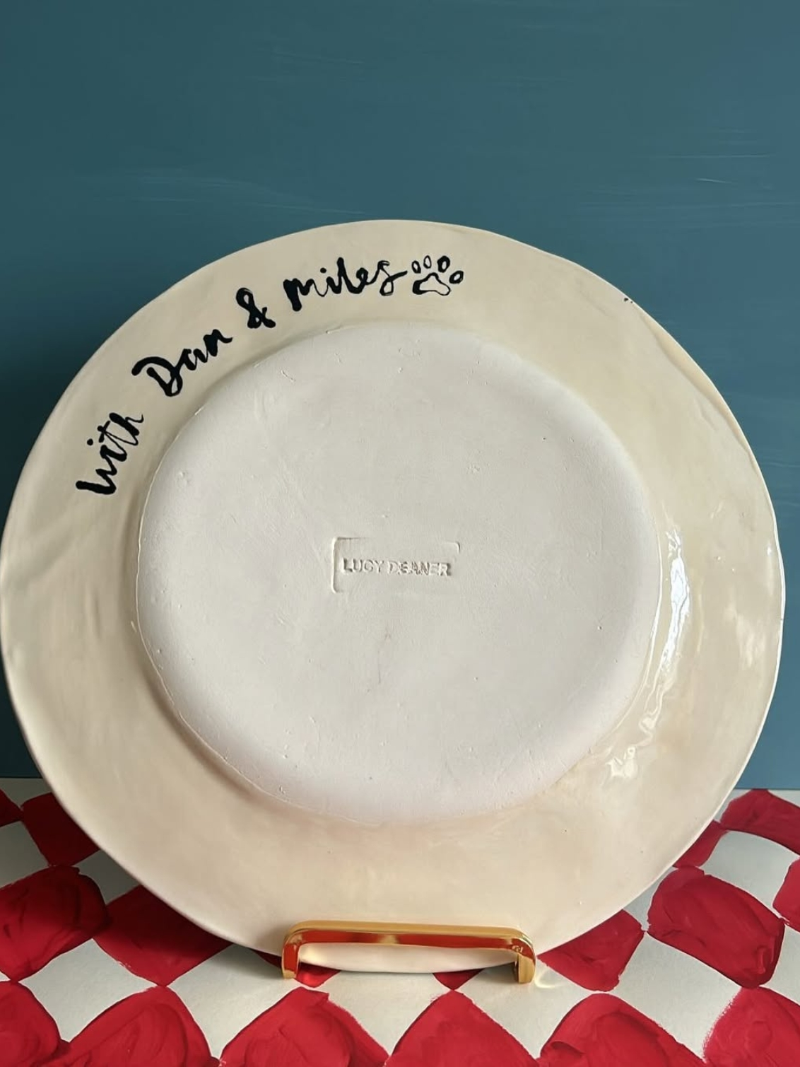 Hand drawn inky text on a handmade earthenware large ceramic plate – created to be a decorative piece for the home