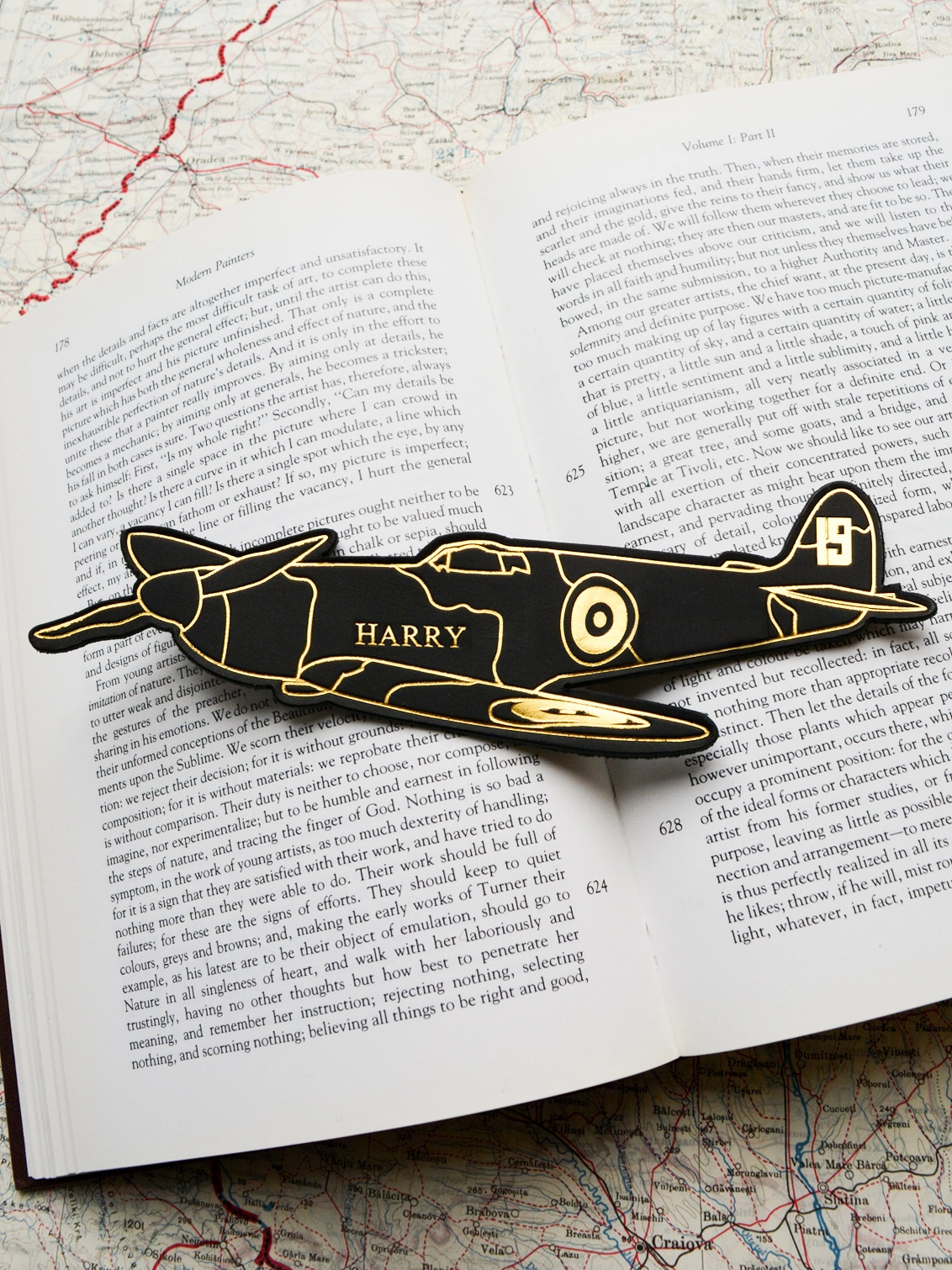 This personalised leather spitfire bookmark is the perfect gift for aviation enthusiasts or history lovers. Made from genuine, sustainably produced vegetable tanned leather with a gold illustration of the Spitfire from the No. 19 Squadron RAF, the first t...