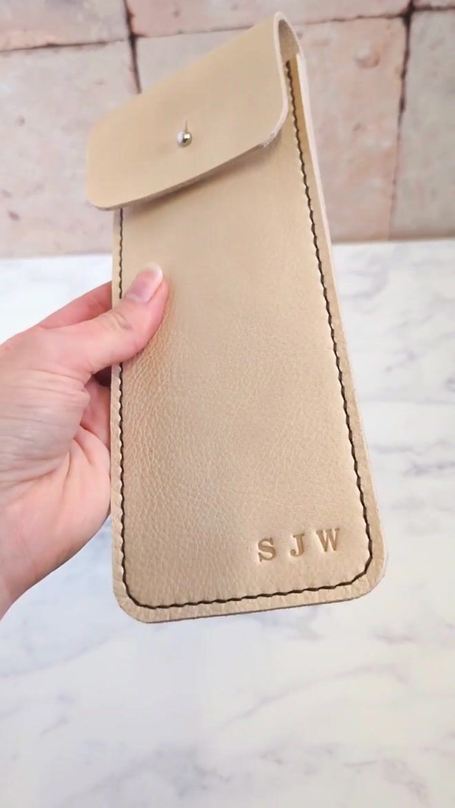 Handmade with either natural cream or hand dyed tan brown leather, both of these leathers have a natural patina and will age and mark with use and vary in hues. Stitched in the thread colour of your choice. Personalised letters are stamped at the bottom right corner, max 3 characters. UPPER CASE alphabet is the only lettering we can offer, numbers '&' . available. Due to the handmade nature some letters may tilt slightly but this is all part of its unique charm.