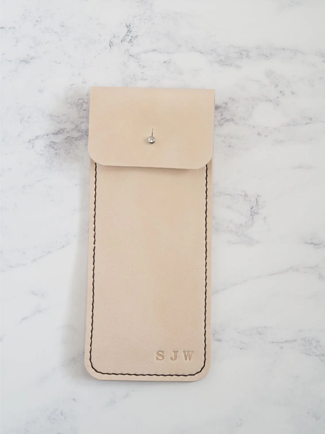 Handmade with either natural cream or hand dyed tan brown leather, both of these leathers have a natural patina and will age and mark with use and vary in hues. Stitched in the thread colour of your choice. Personalised letters are stamped at the bottom right corner, max 3 characters. Upper case, numbers '&' . available. Due to the handmade nature some letters may tilt slightly but this is all part of its unique charm.