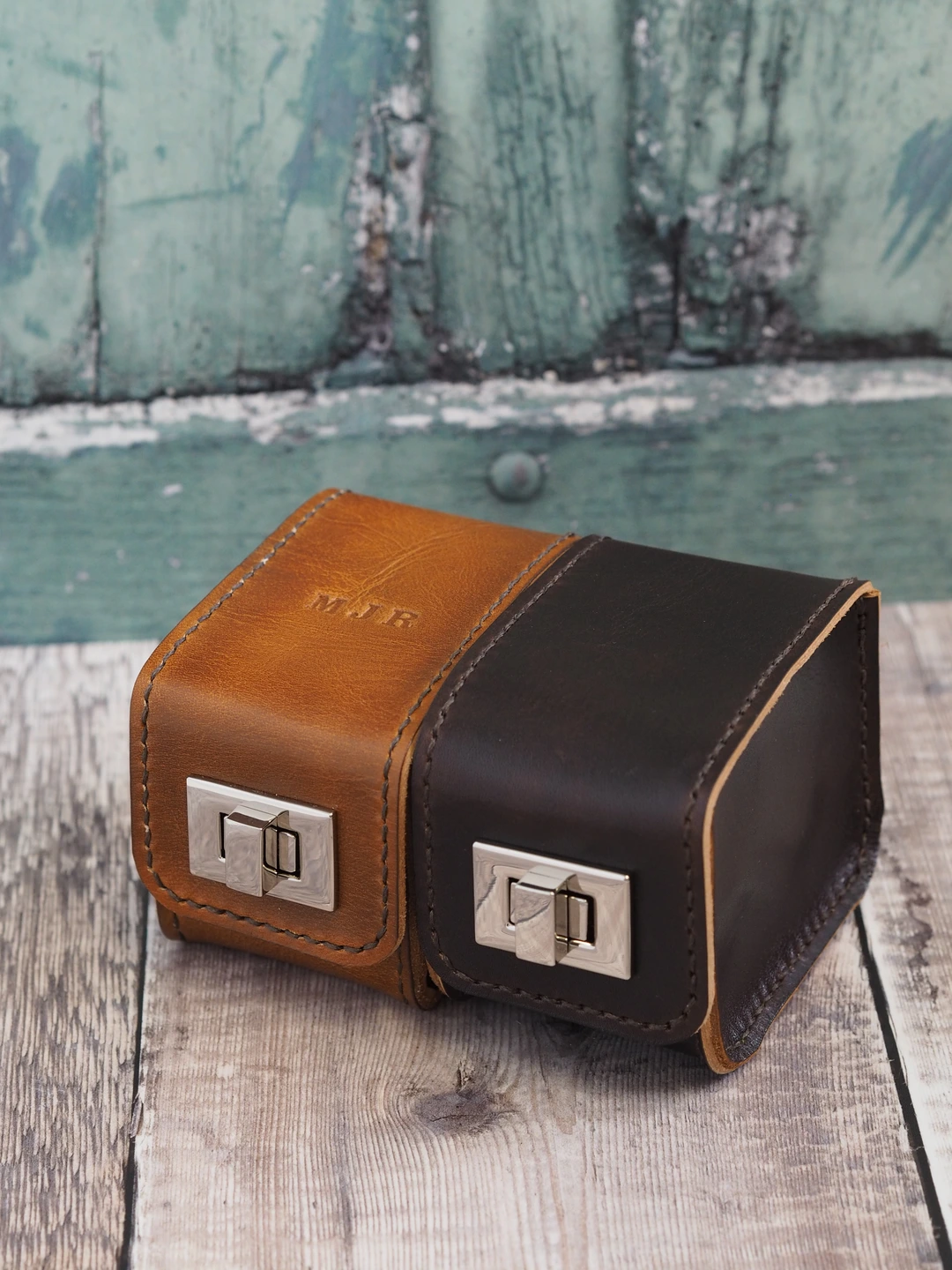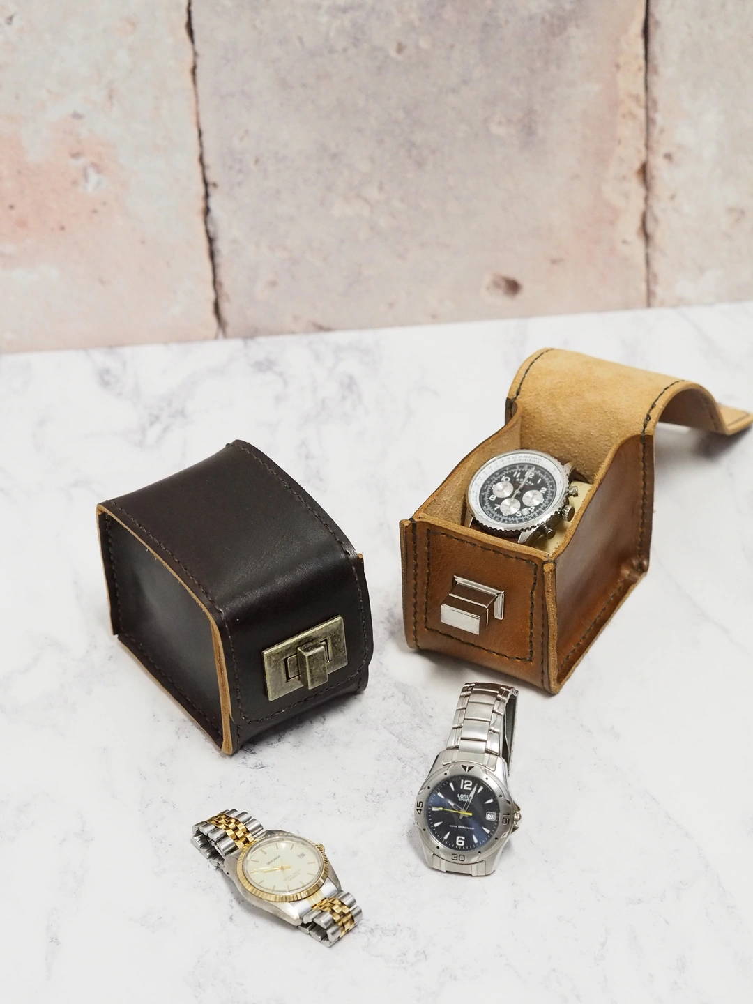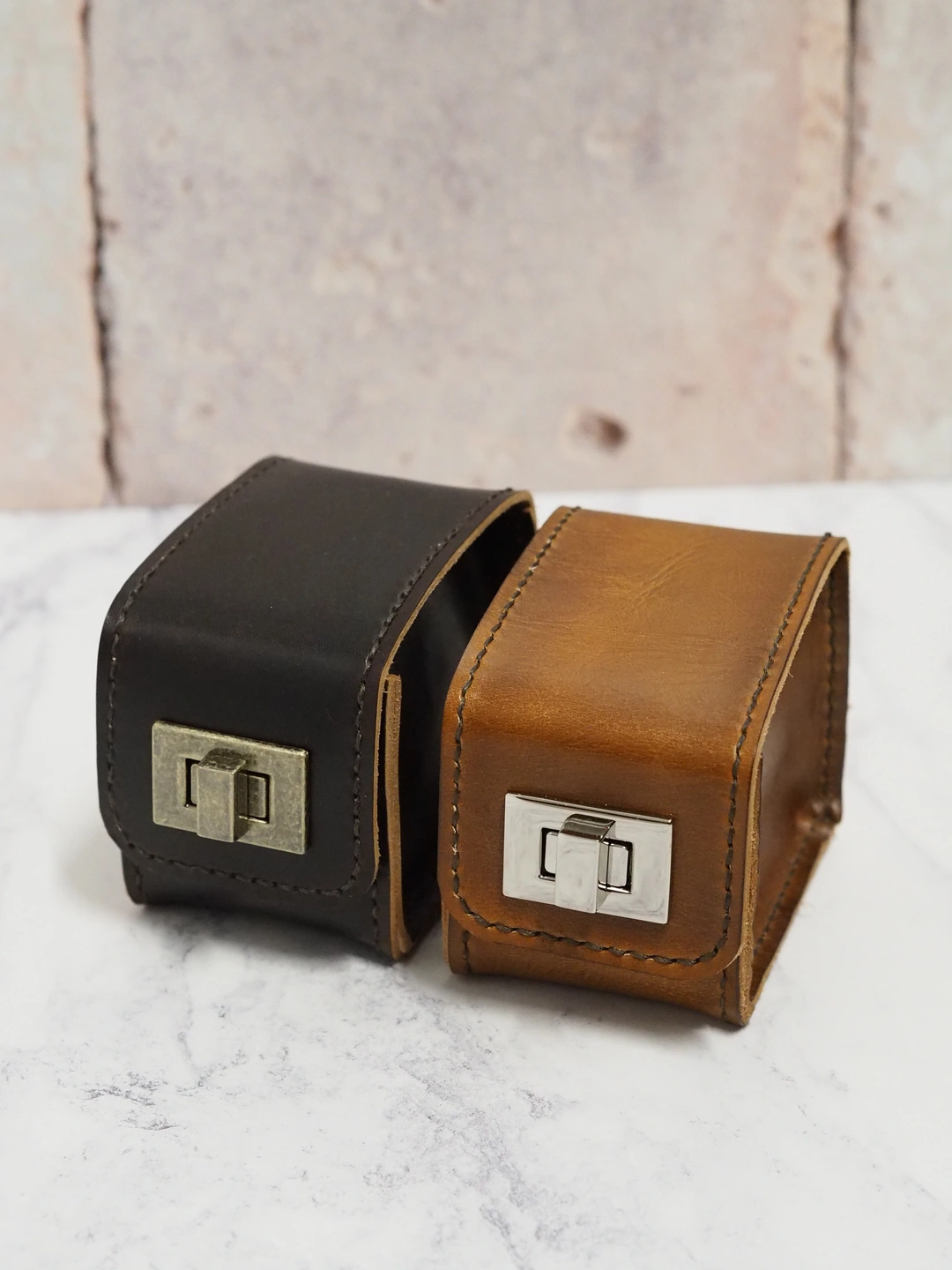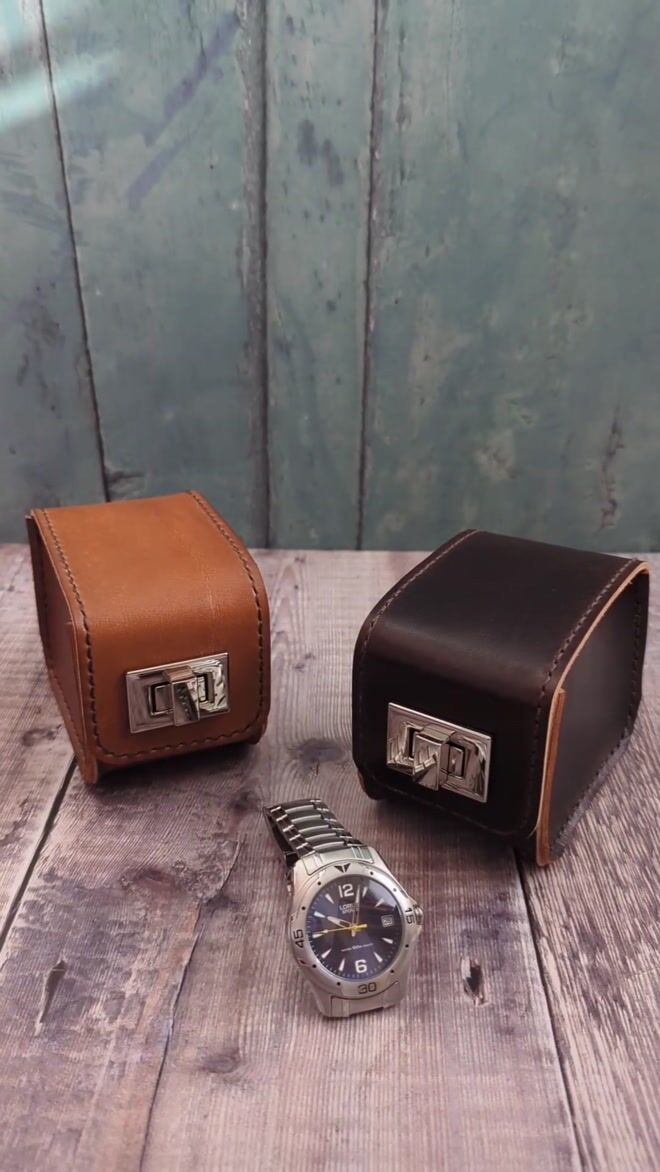 Our handmade leather carry case designed for holding a single wrist watch. Choose between our hand dyed colours of tan or dark brown, both hand stitched with complimentary dark brown thread. Finished with a chunky metal turn lock clasp for open and closure.