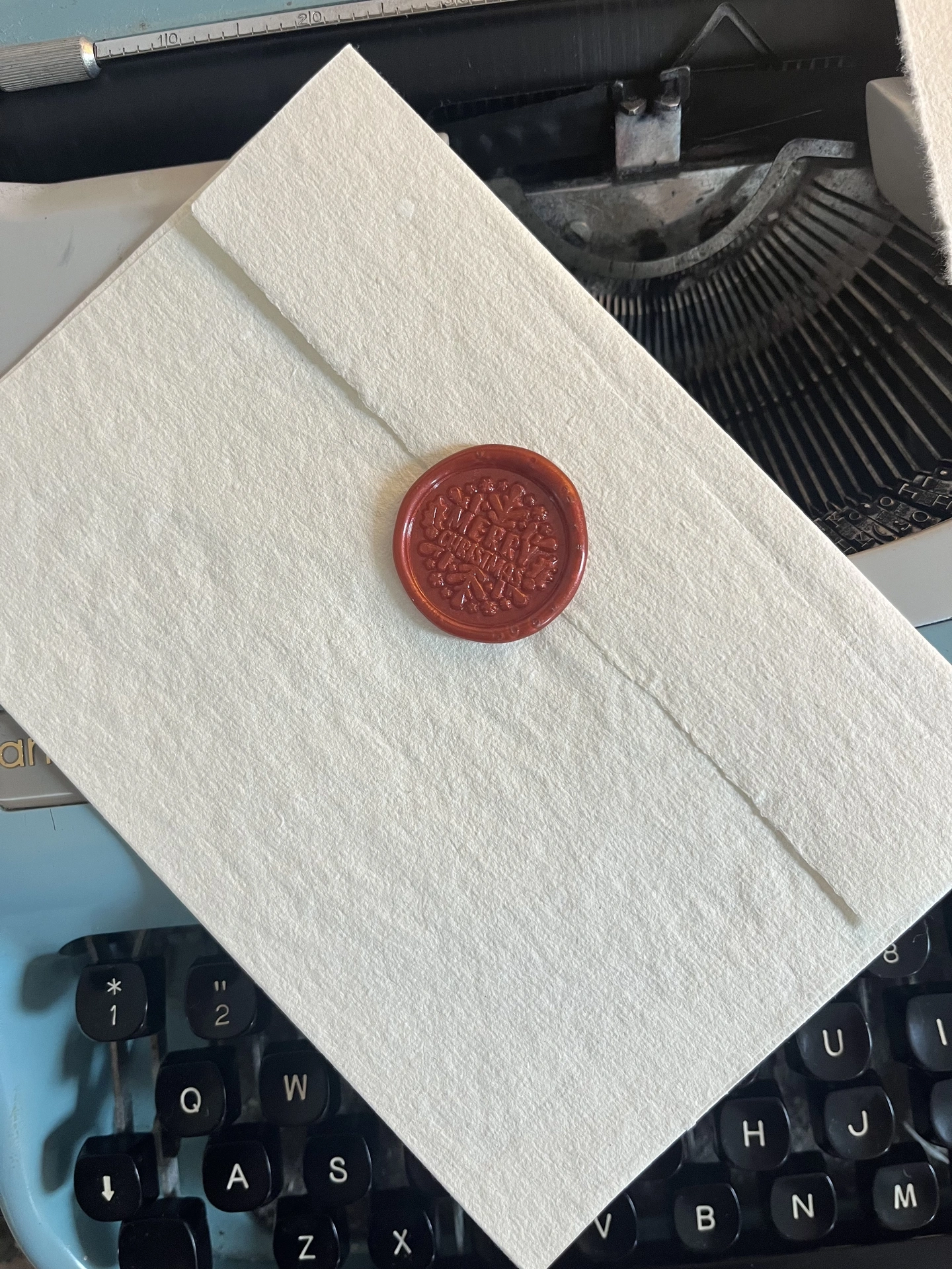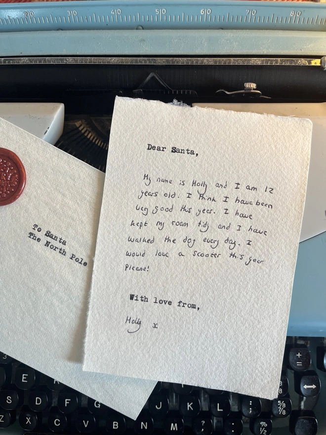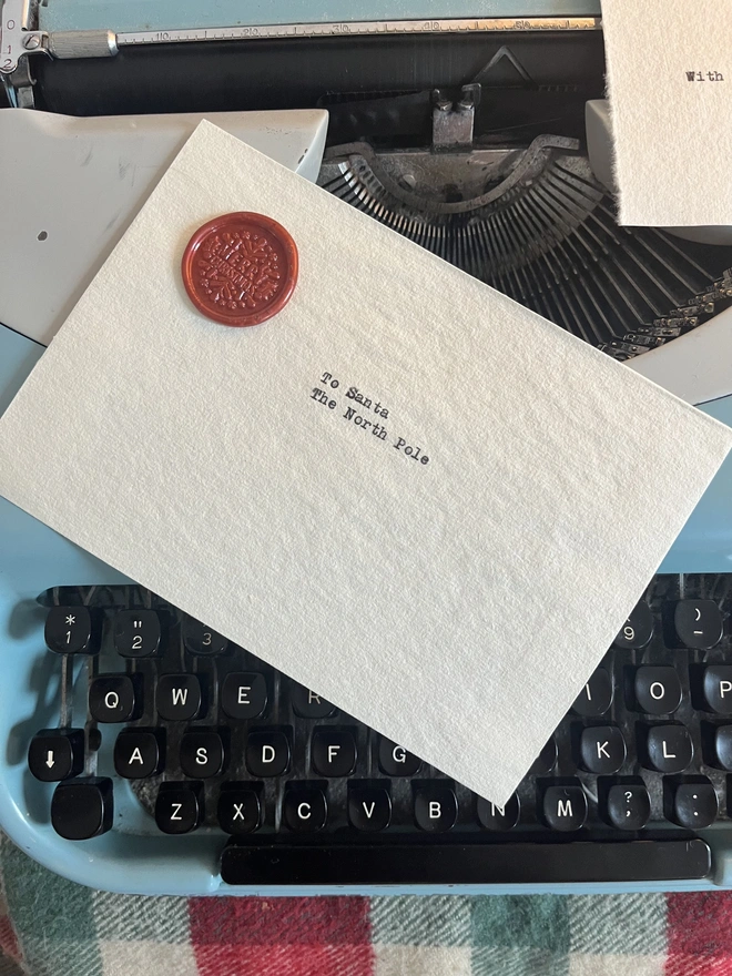 Included with this set is also a c6 envelope addressed to Santa at the North Pole (also typed on my typewriter), as well as a merry christmas wax seal in red with a self-adhesive sticker on the back so you can seal the letter shut once your child has finished writing it.