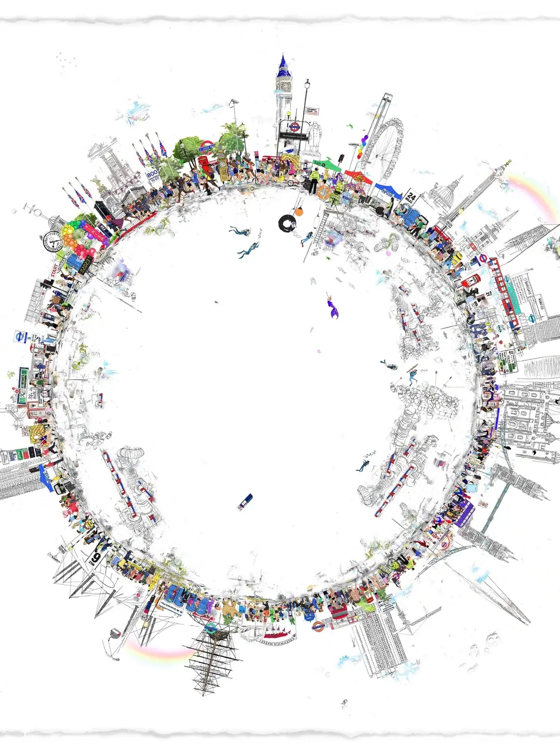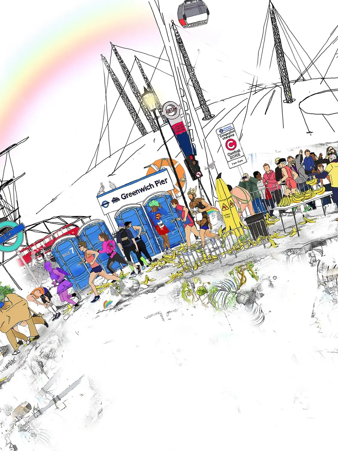 An illustrated course map of the world famous London Marathon route. Follow your eye along the 26 mile journey which starts from Greenwich Park Blackheath moving across South-east London making your way over the river and continuing east until you eventua...