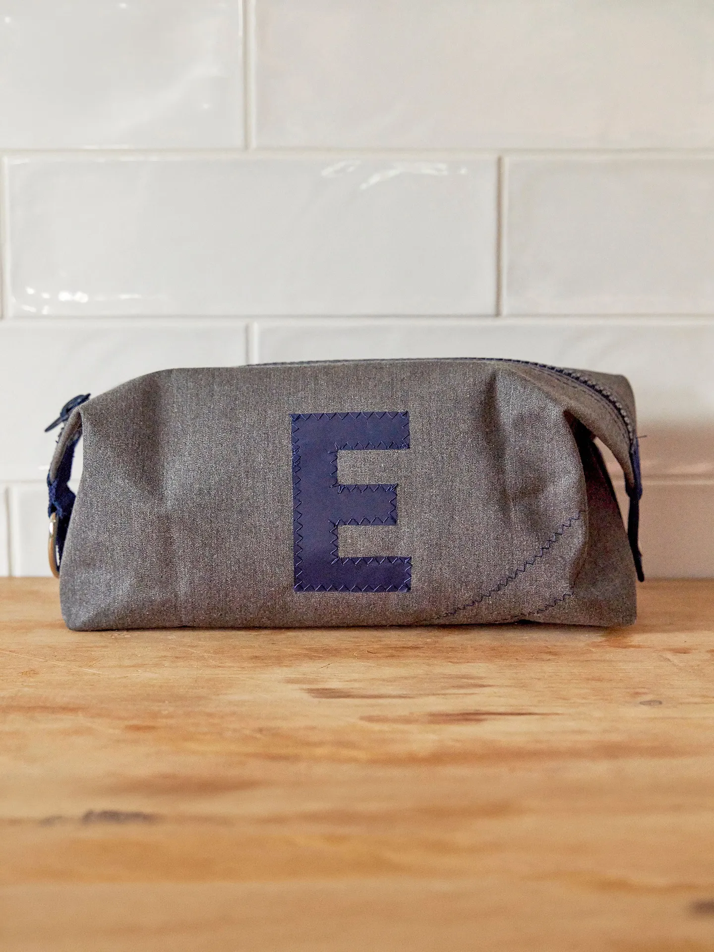 Personalise with 1 or 2 letters in navy insignia, stitched in navy zigzag.