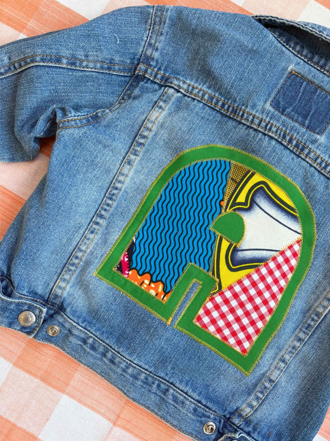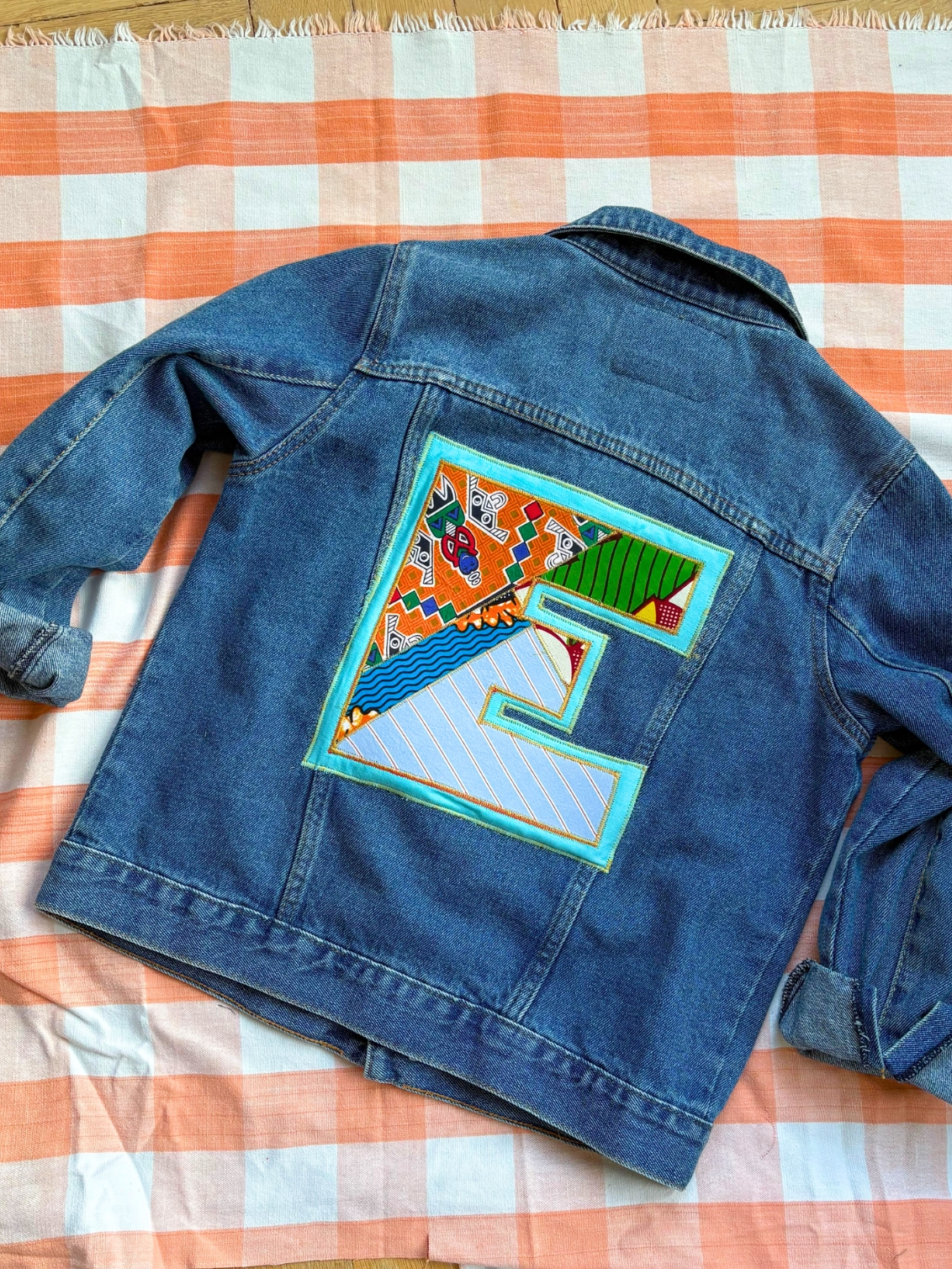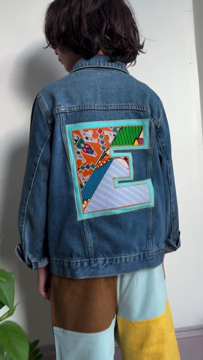 This upcycled vintage denim jacket has been transformed into a unique, eco-friendly statement piece with the addition of a retro block print initial in a mix of bright clashing prints. Each jacket is handmade to order in my London studio, making it a trul...