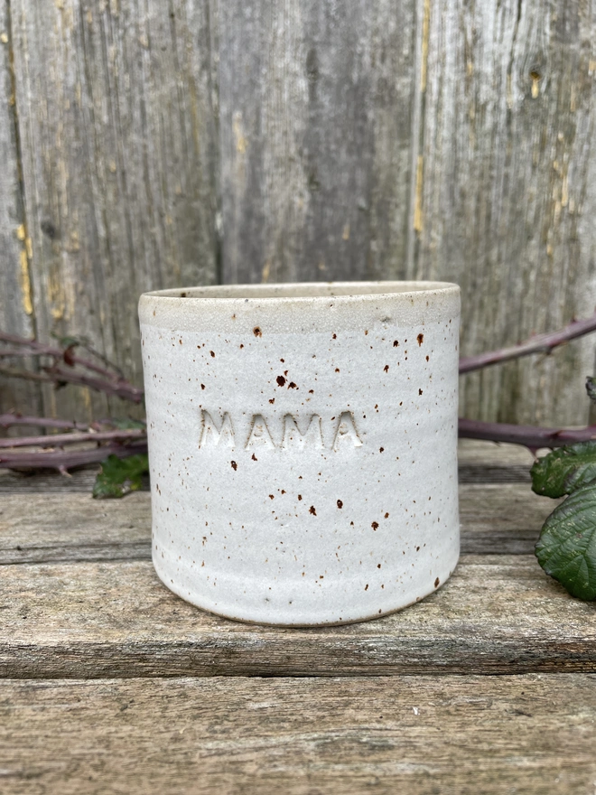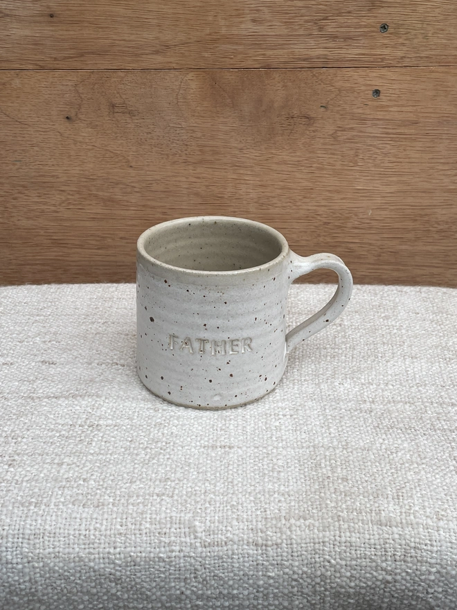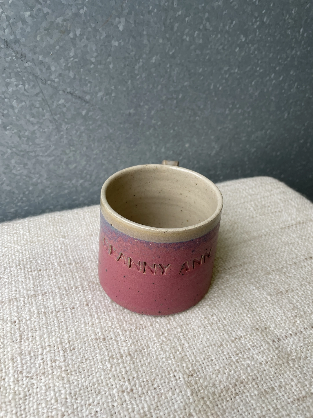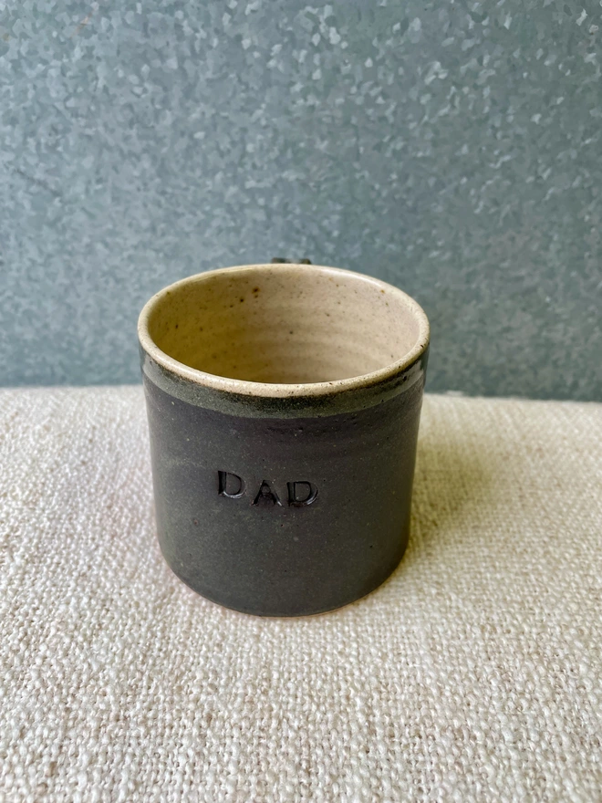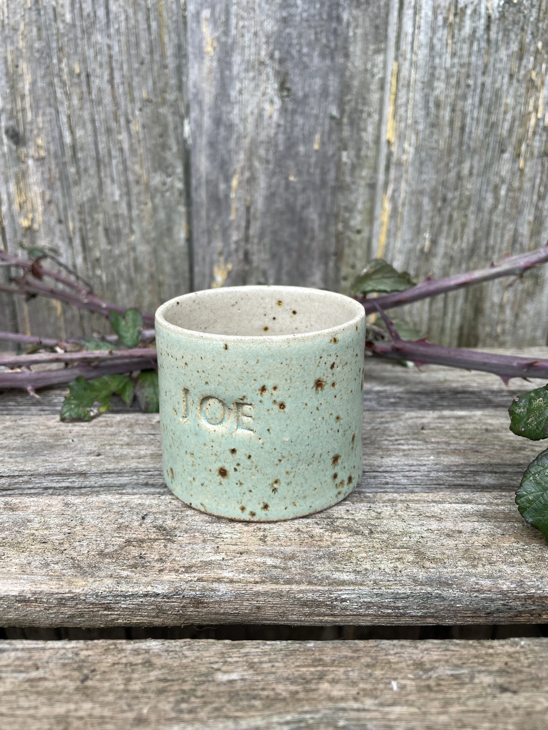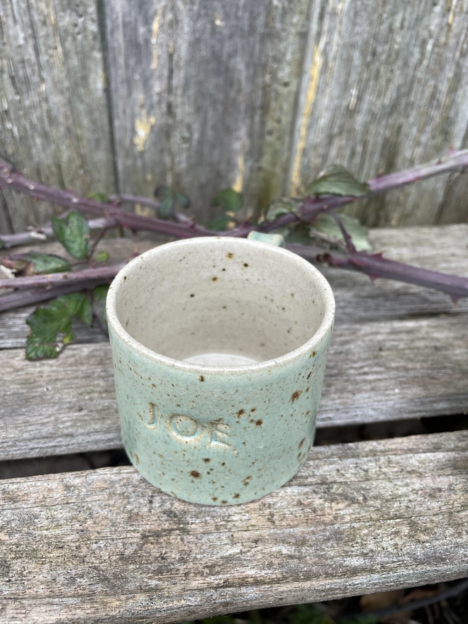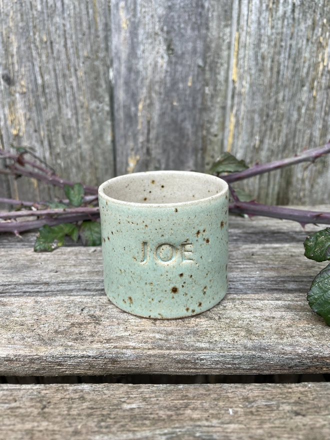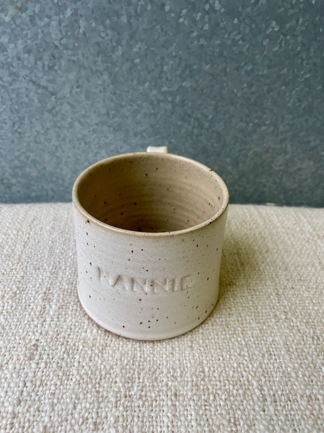 Beautiful hand-thrown mug with your name of choice or short phrase hand stamped on it...