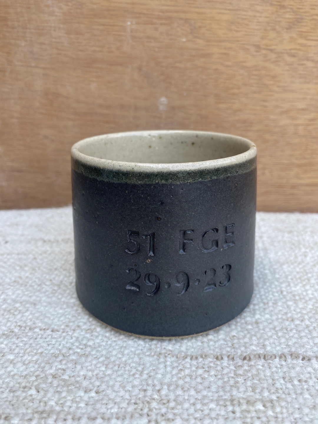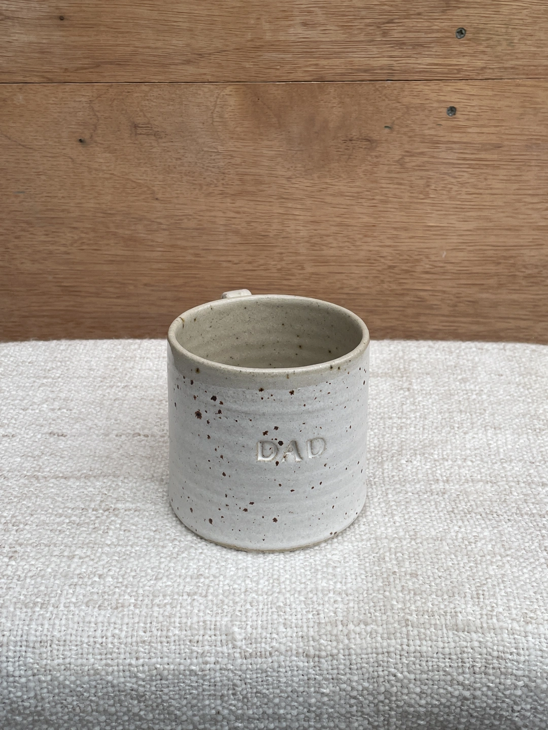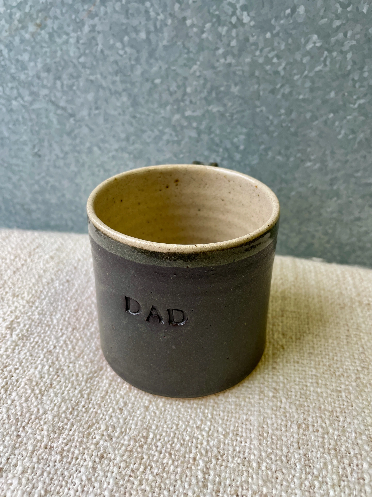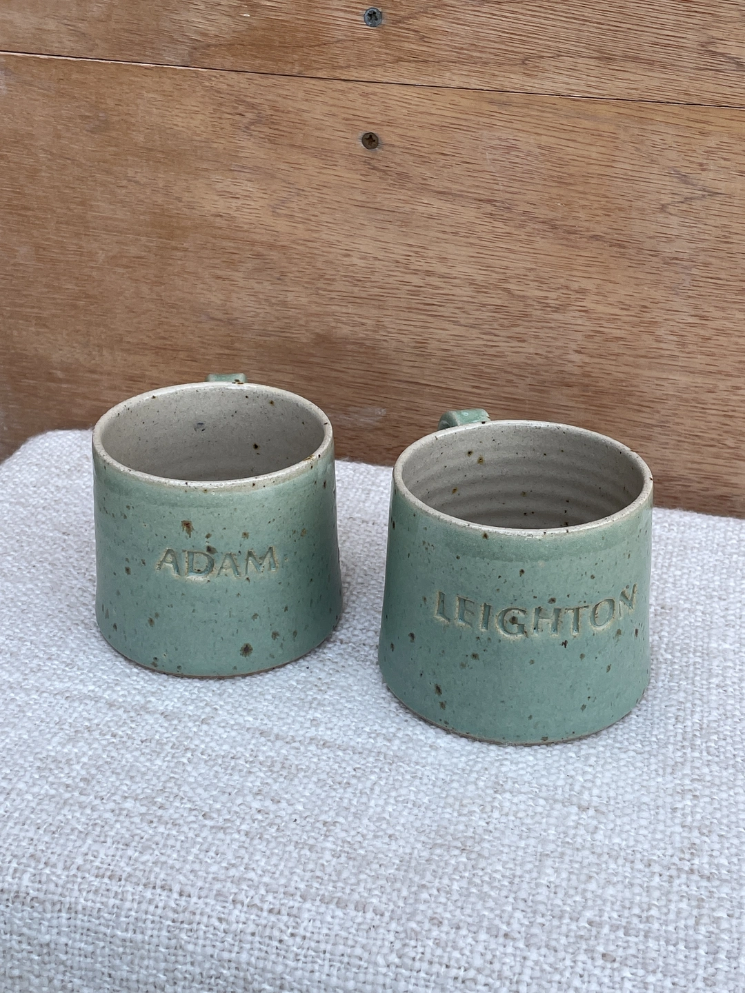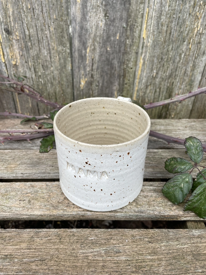 Beautiful hand-thrown mug with your name of choice or short phrase hand stamped on it...