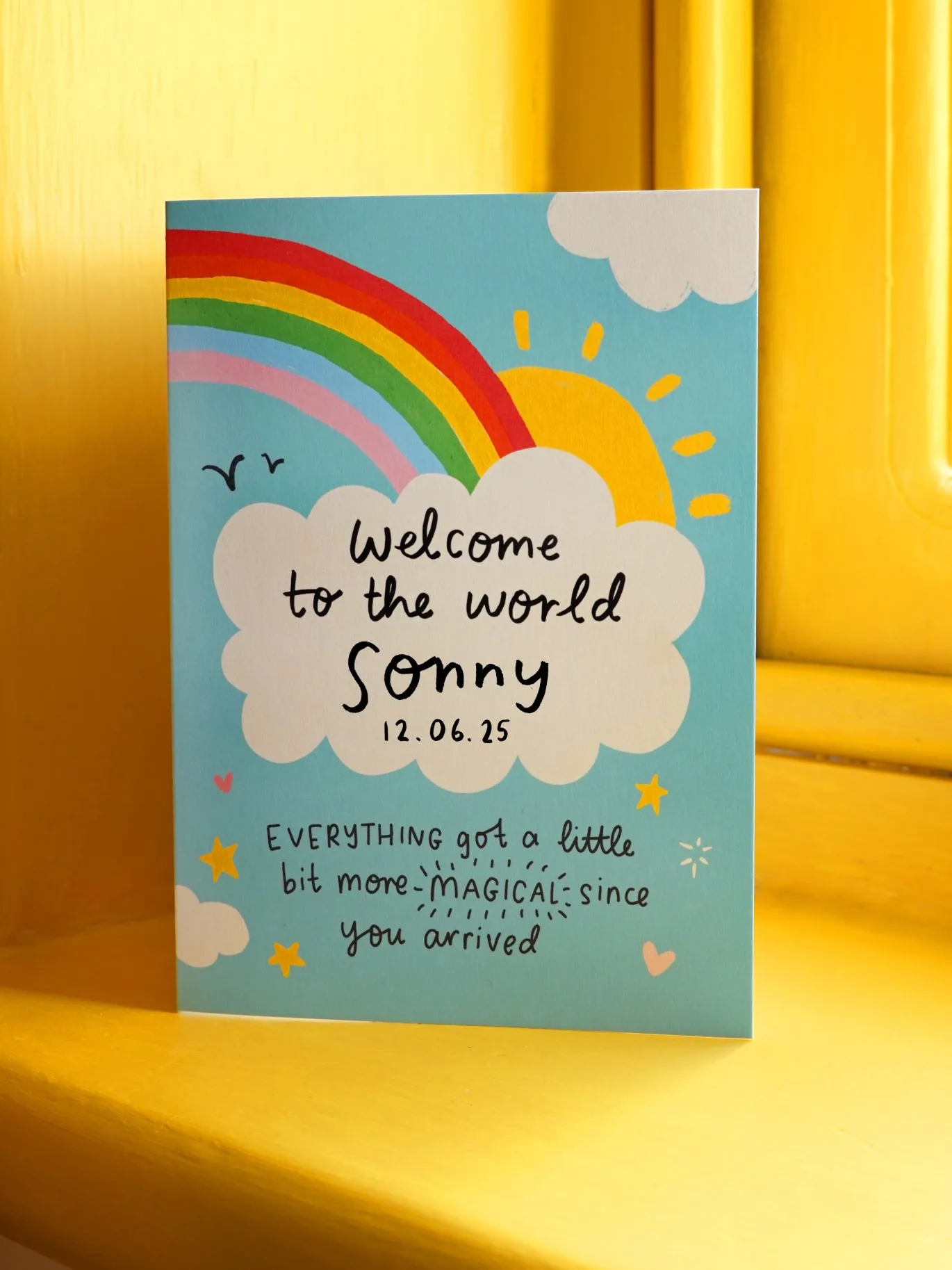 Welcome to the world. Everything got a little bit more magical since you arrived. Personalised with a handwritten name(s) of your choice, you can include a nickname or ‘little one’ if you don’t know the name yet. You can also include the date of birth under the name if you like.