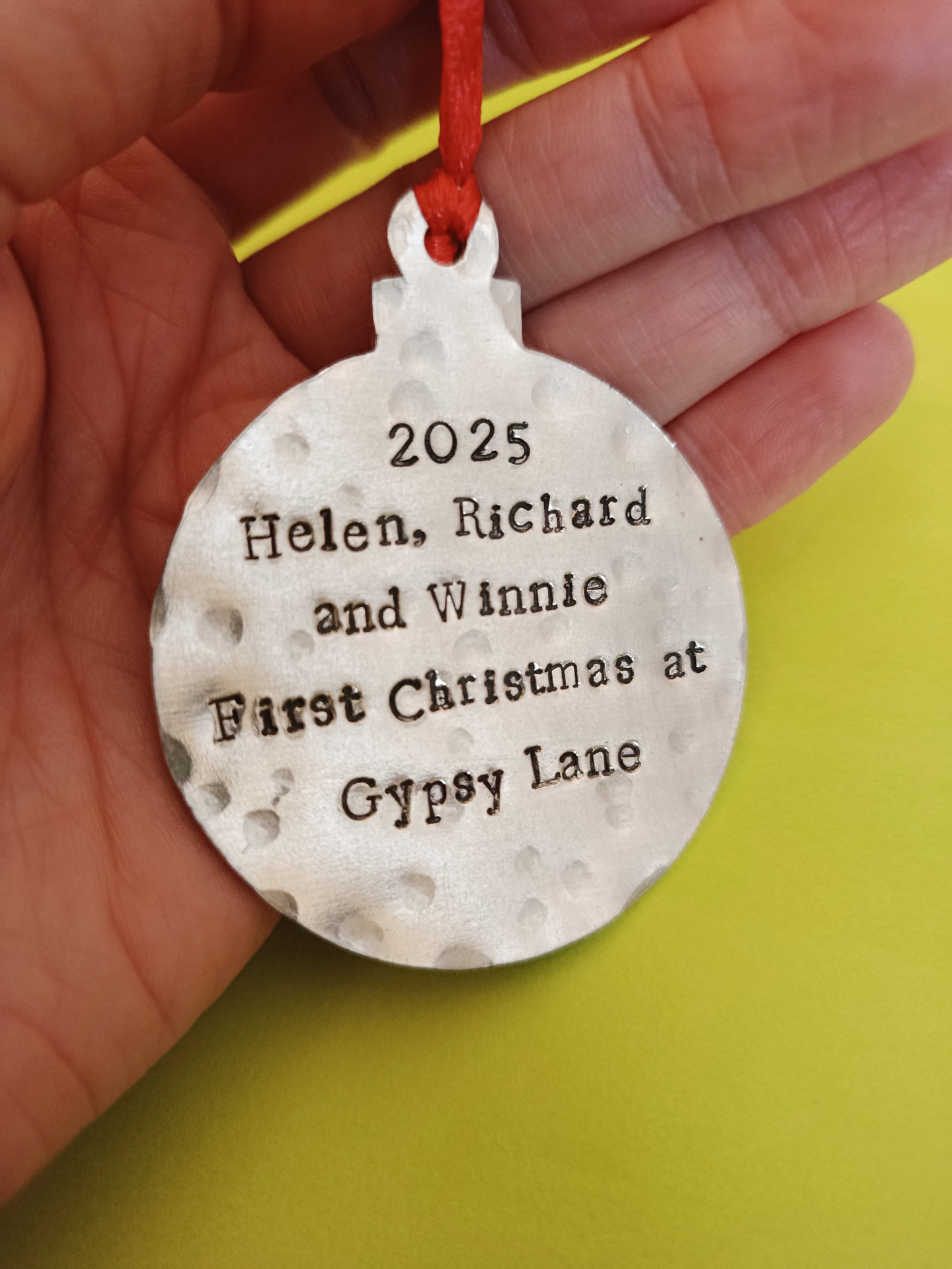 Hand stamped aluminium bauble decoration. Personalised with anything you like!