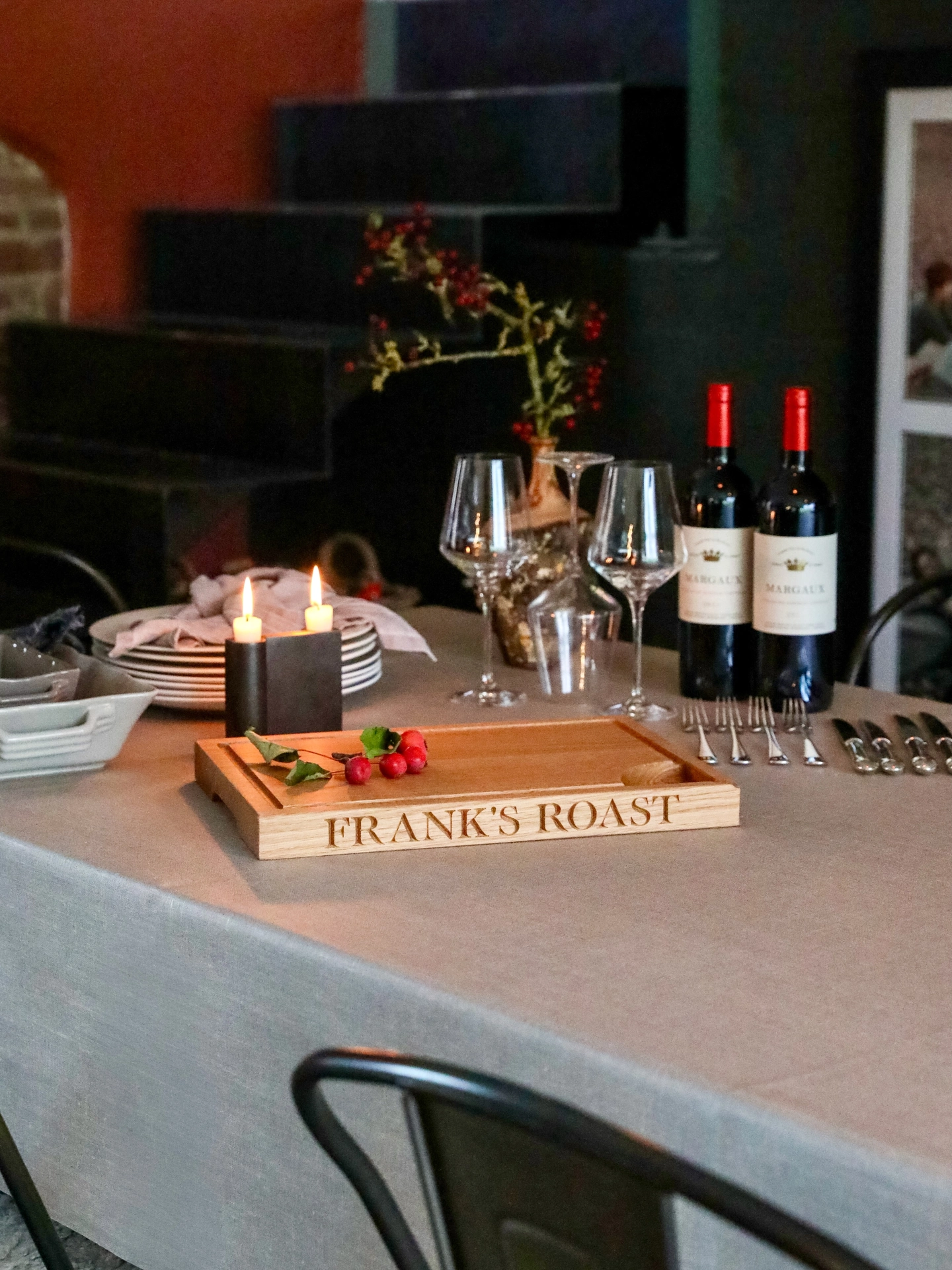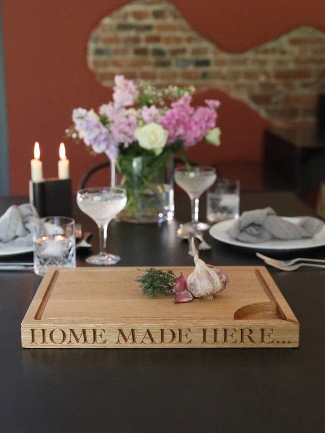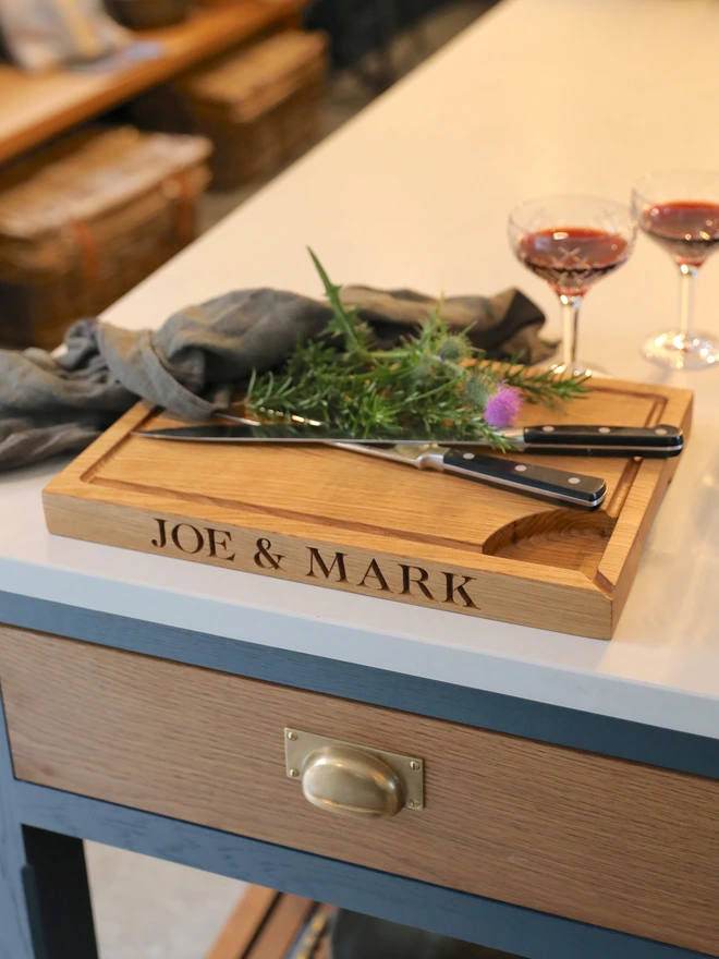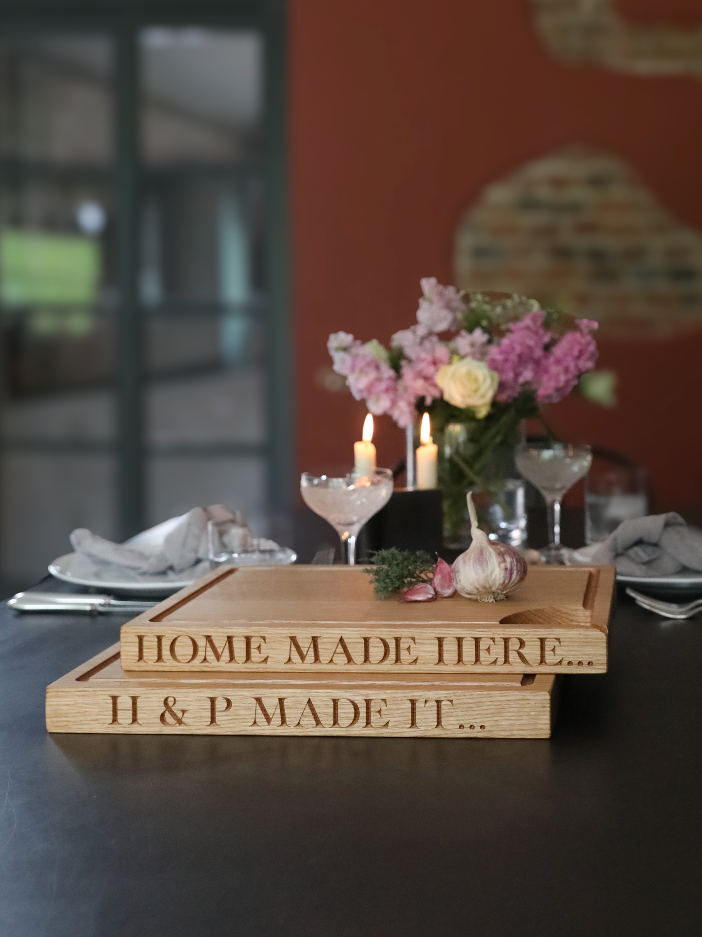 With the hand carved wording of your choice (up to 20 characters on each side) our carving board becomes an instant heirloom. Often these are given as a wedding gift as they are the perfect home maker present. With a house or family names engraved they are a present the whole family will enjoy.