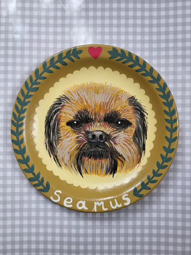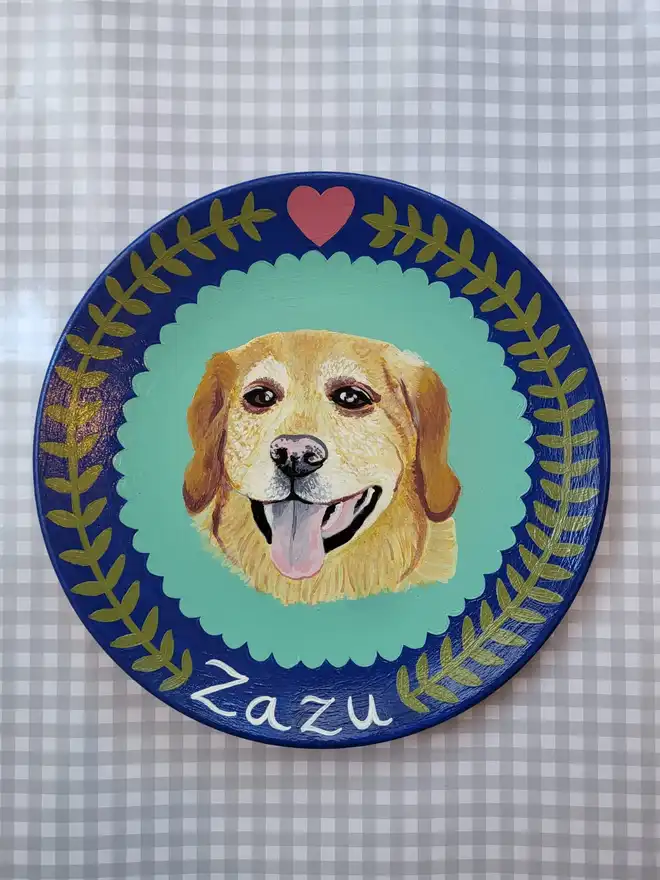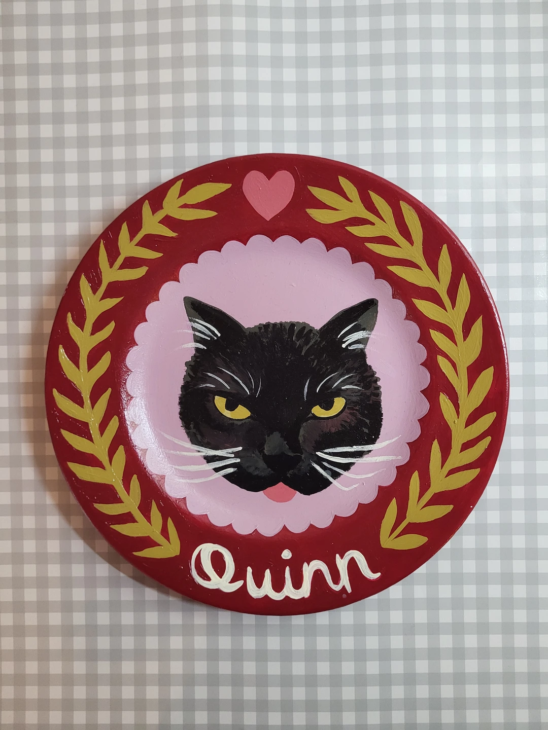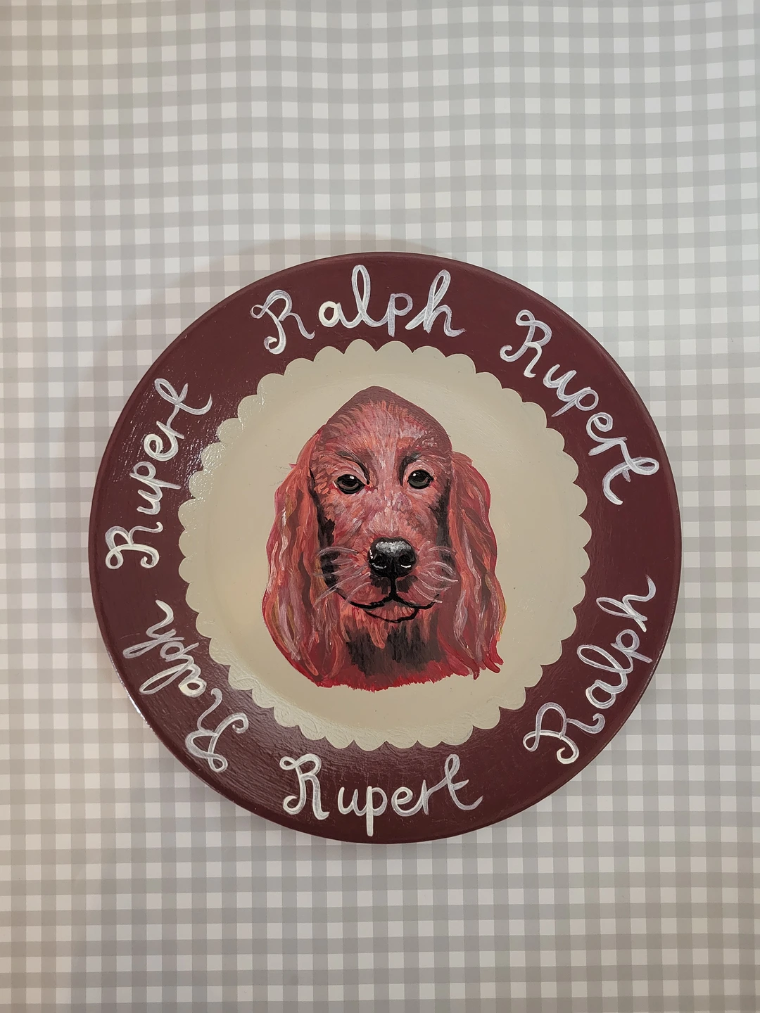 Custom pet portrait on a salvaged ceramic wall plate. Each plate is hand painted in vibrant colours and finished with a gloss varnish.