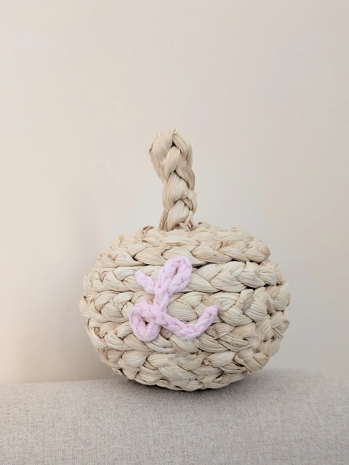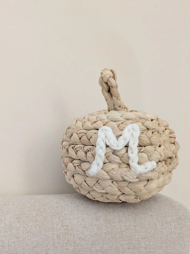 Straw Pumpkin personalised with the initial of your choice or the word “Boo”.