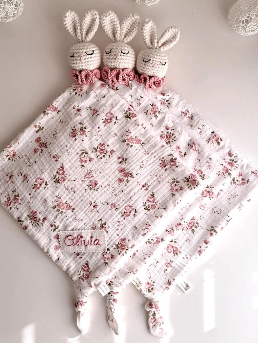 Welcome a new baby into the world with a charming little friend that’s as soft as a cloud. This adorable bunny snuggle blankie is crafted to be the ideal comfort buddy, with a hand-crocheted bunny head in brushed ivory cotton and angora yarn, giving it a velvety, gentle feel. The bunny's delicate pink ruffle collar and hand-embroidered sleeping eyes and tiny nose make it irresistibly sweet.