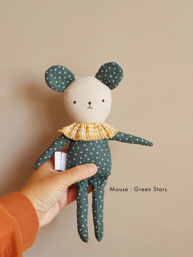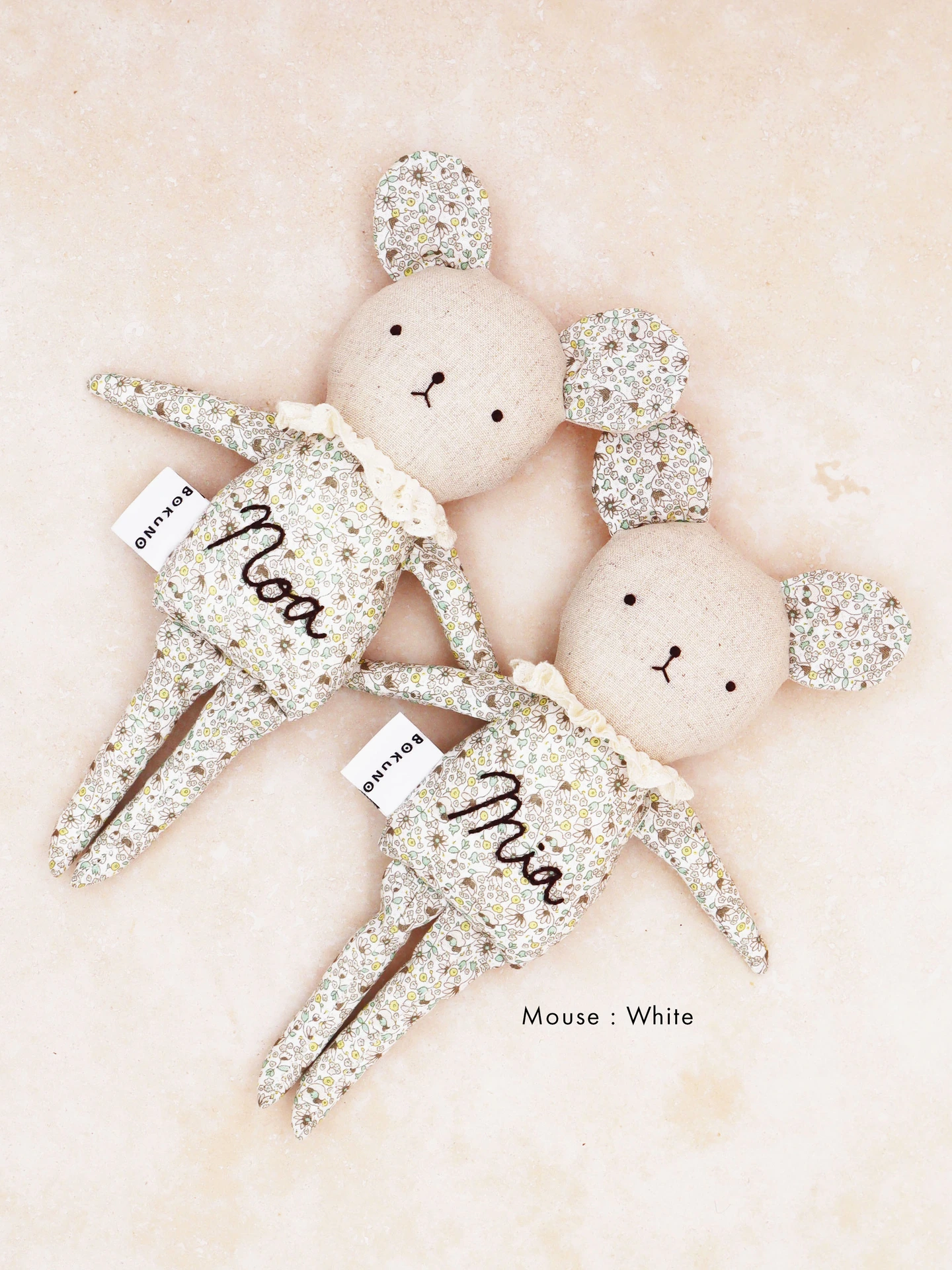 Handmade animal dolls - bunny, mouse and cat - crafted with love and care. Each doll wears a charming all-in-one PJ made from beautiful printed cotton, complete with a vintage-inspired broderie anglaise frill collar for a timeless look. Add a cosy sleepin...