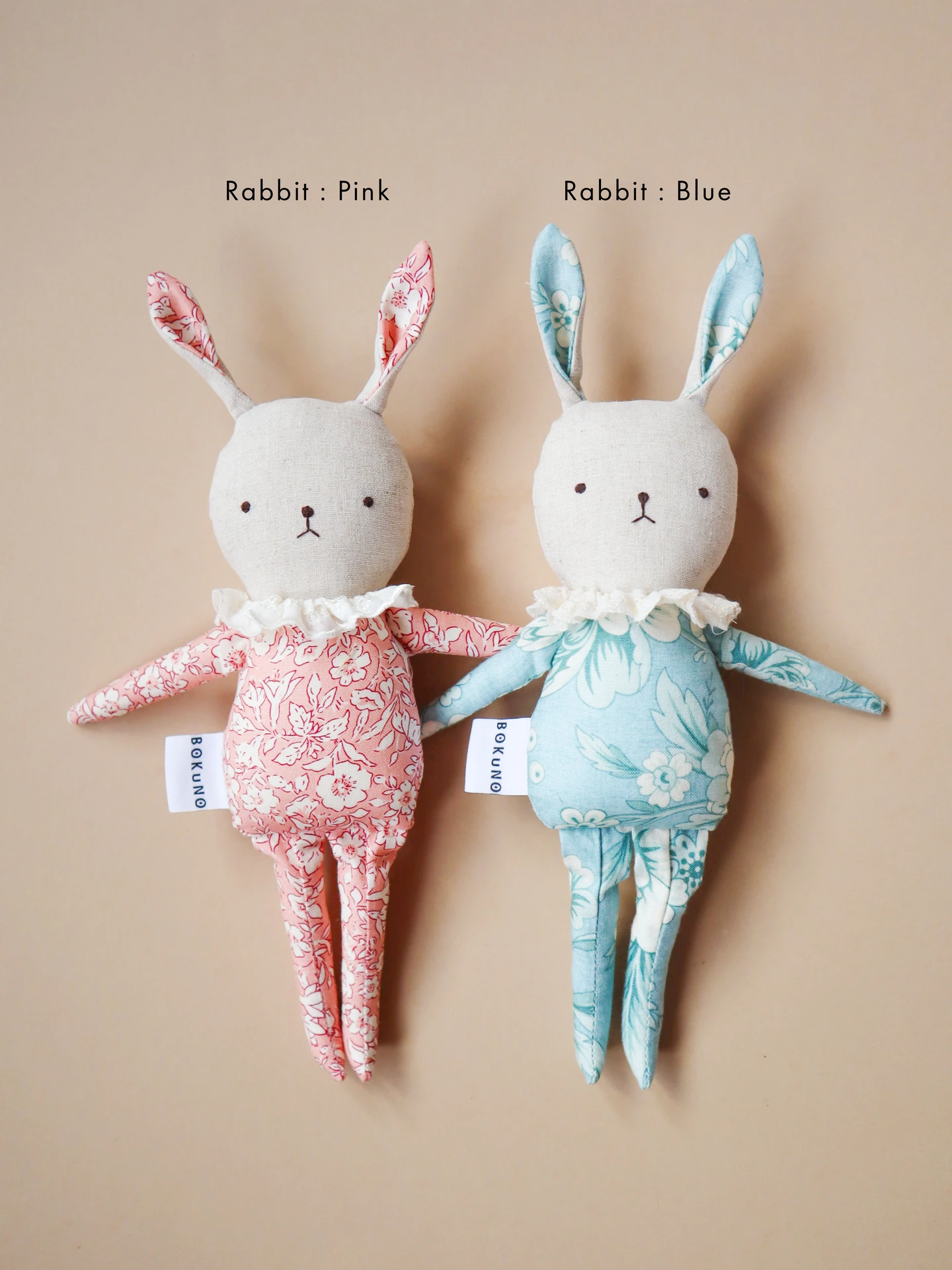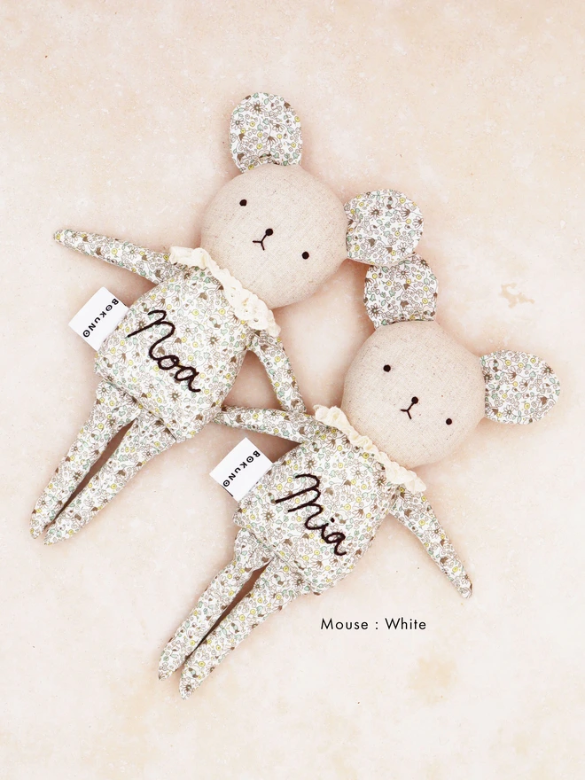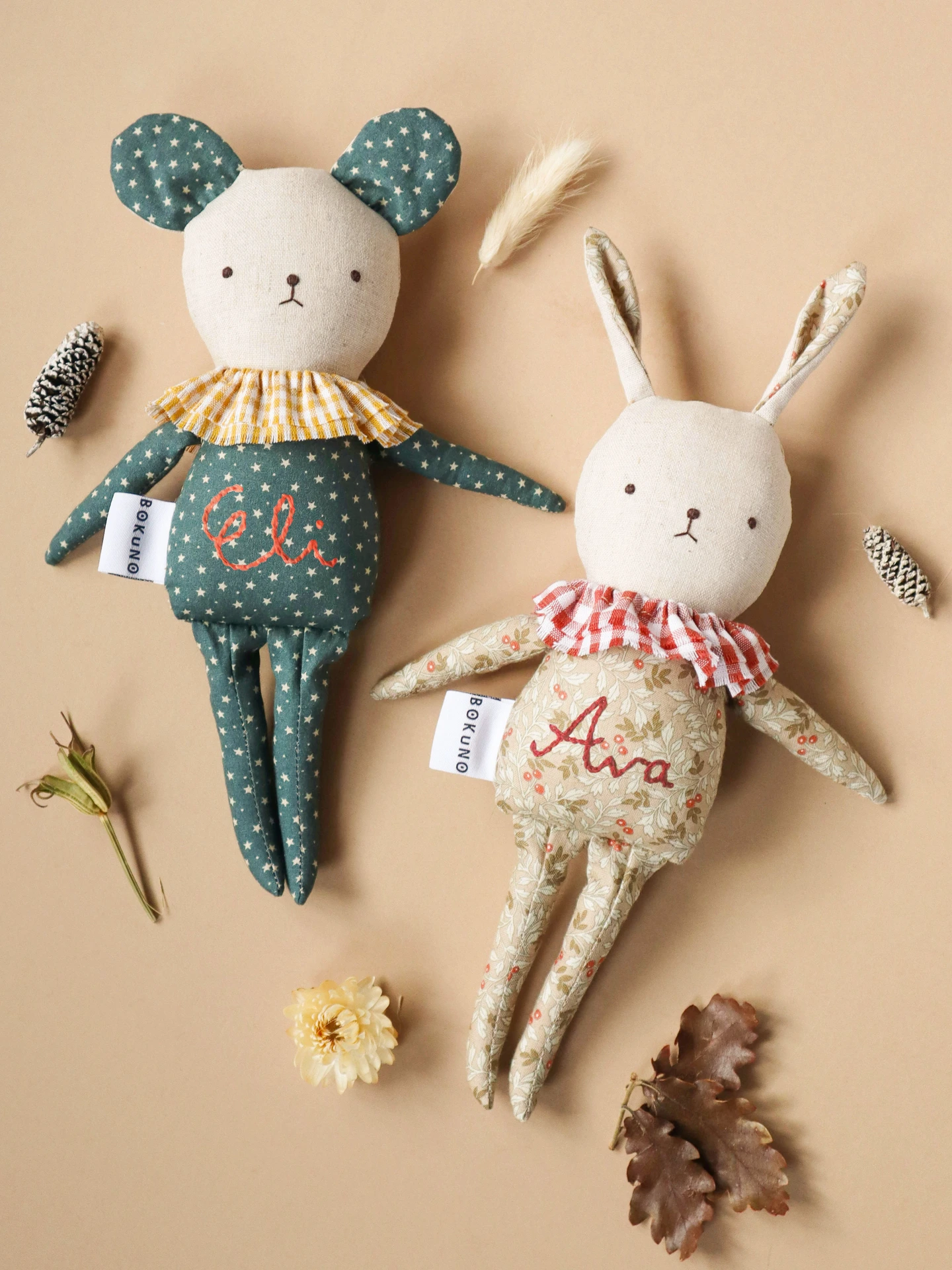 Handmade animal dolls - bunny, mouse and cat - crafted with love and care. Each doll wears a charming all-in-one PJ made from beautiful printed cotton, complete with a vintage-inspired broderie anglaise frill collar for a timeless look. Add a cosy sleeping bag for them to snuggle in, and make it truly special with personalised hand embroidery. Made with natural fabrics like cotton and linen, these heirloom-quality creations are perfect for gifting or cherishing forever.