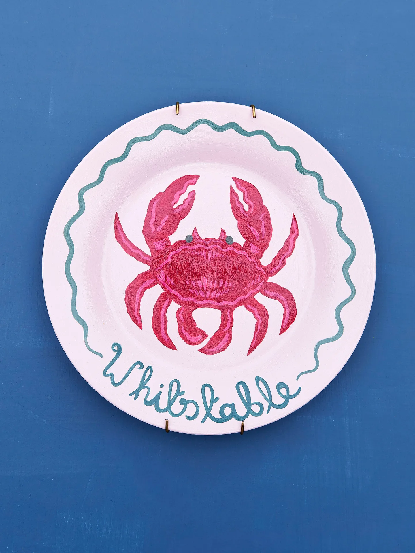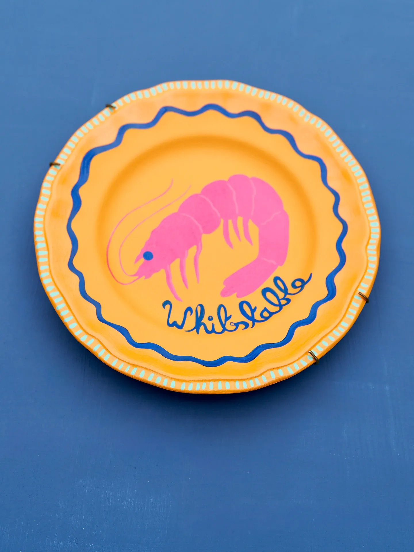 Ceramic wall plate, salvaged and painted in vibrant colours and gloss varnish.